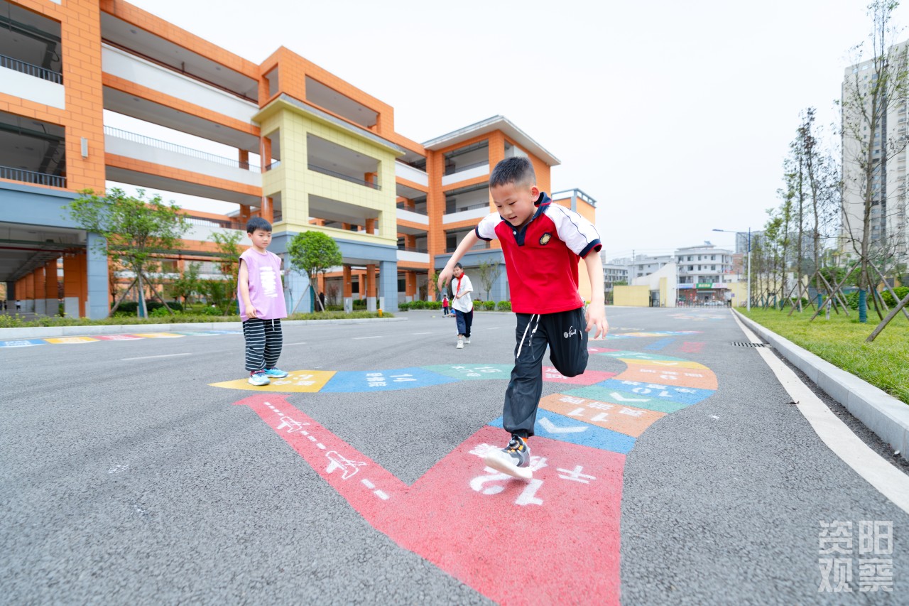 孩子们在校园地面的石刻游览图上“跳格子”。