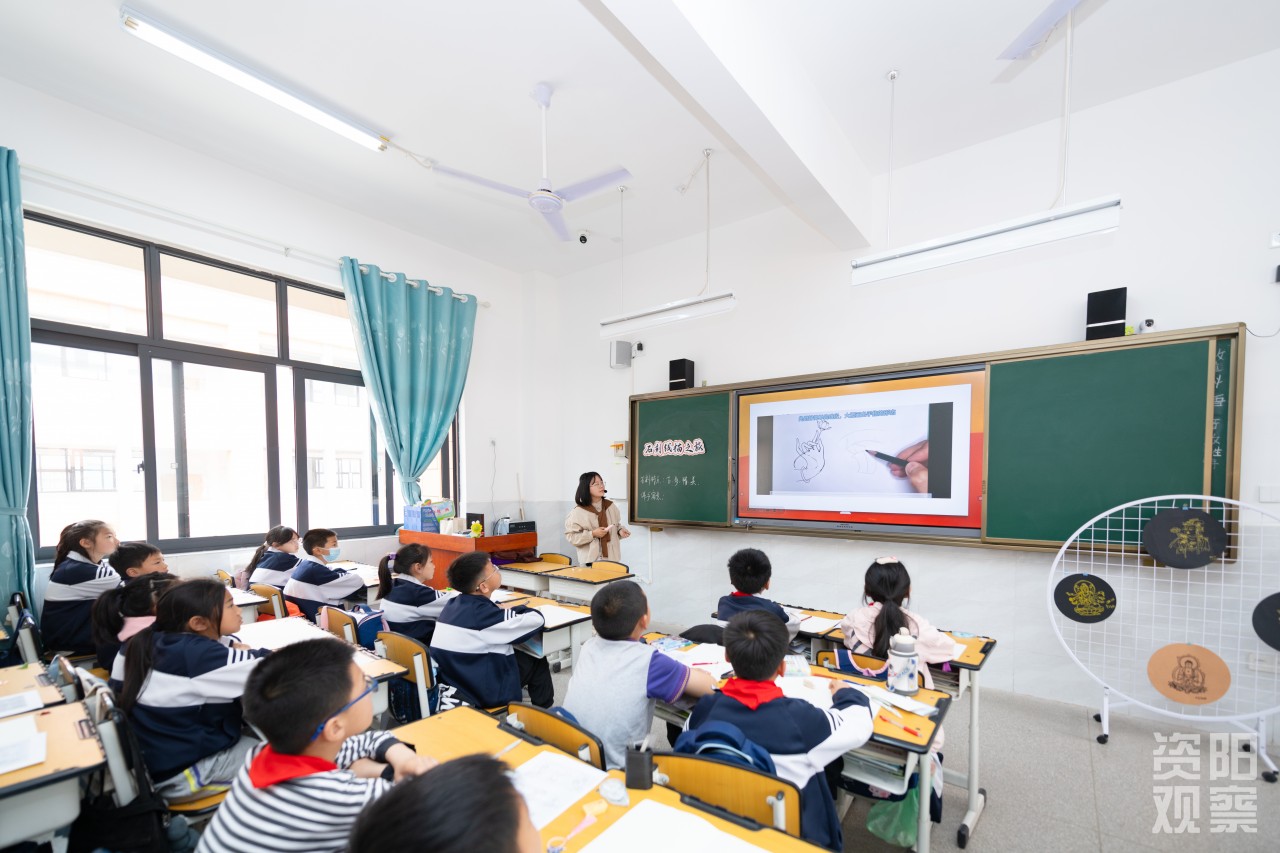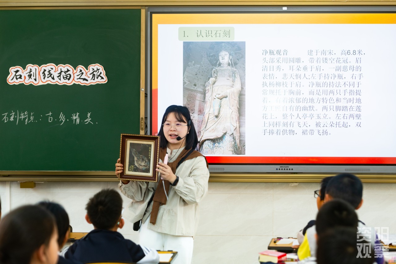 安岳县岳石小学将石刻艺术融入美术课堂。学生通过临摹紫竹观音飘逸的衣褶,创作石刻泥塑等作品,在传统纹样中培养艺术感知力。邀请安岳石窟研究院工作人员到校,持续开展“石窟文化进校园”活动,已开展4期石窟文化小课堂,让学生执笔绘家乡,同心传承石刻文化。