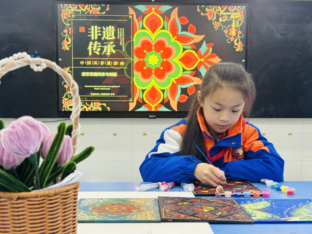 安岳县工业大道小学将传统漆画艺术融入小学美术课程,通过“基础技法学习-文化内涵理解-创意实践应用”的教学模式,帮助学生掌握漆画技艺核心,创作具有时代特色的艺术作品。课程以“活态传承”为核心理念,打造属于工小的非遗艺术印记。课程实施后,学生非遗知识掌握率显著提高,文化认同感明显增强。