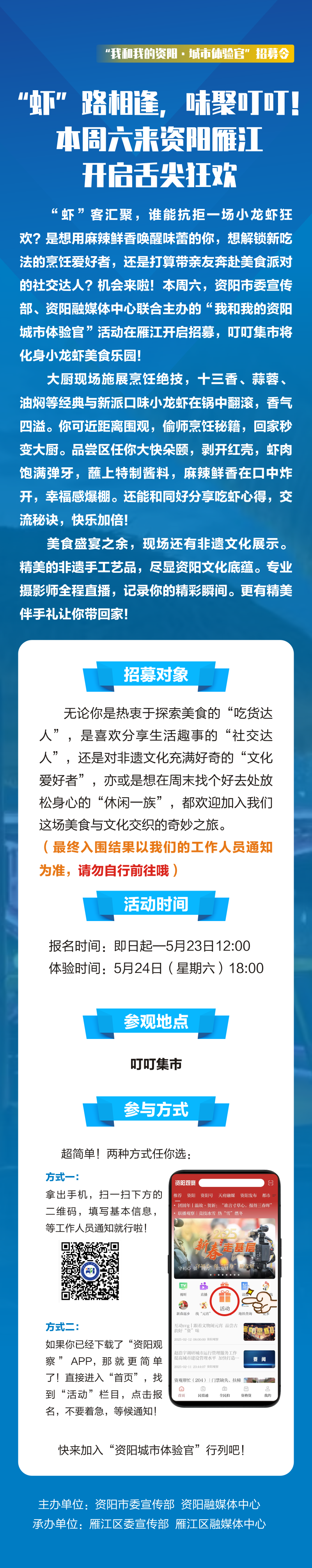 “虾”客汇聚,谁能抗拒一场小龙虾狂欢?是想用麻辣鲜香唤醒味蕾的你,想解锁新吃法的烹饪爱好者,还是打算带亲友奔赴美食派对的社交达人?机会来啦!本周六,资阳市委宣传部、资阳融媒体中心联合主办的“我和我的资阳 城市体验官”活动在雁江开启招募,叮叮集市将化身小龙虾美食乐园!