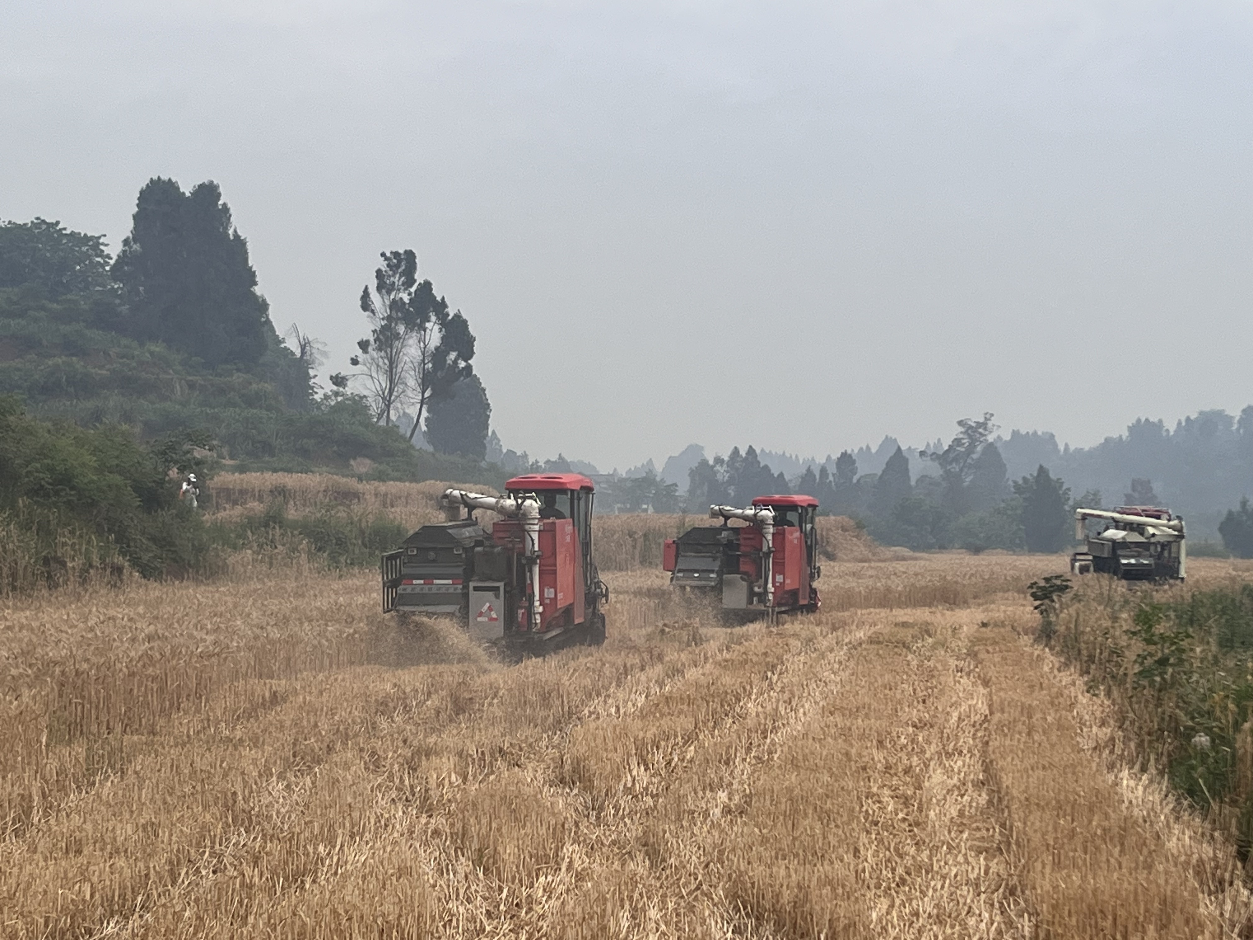 仲夏时节,雁江区丹山镇三合村5组的梯田里,3台收割机正轰鸣着穿梭在金色麦浪中,将沉甸甸的麦穗卷入机仓。田埂边,雁江区润佳家庭农场负责人王仲康捧着刚打下的麦粒感叹:“麦粒饱满得像小珍珠,今年又是个丰收年!”