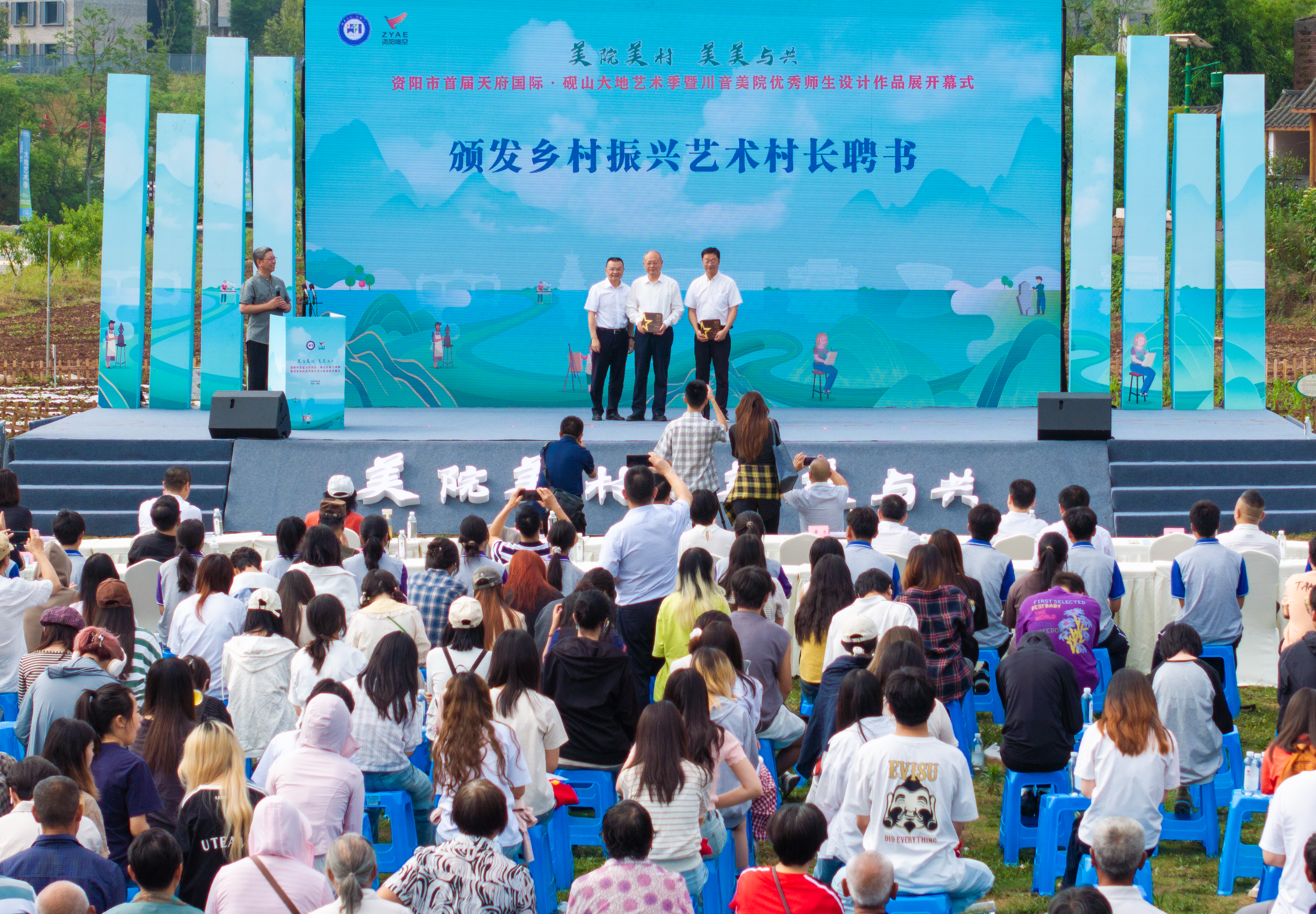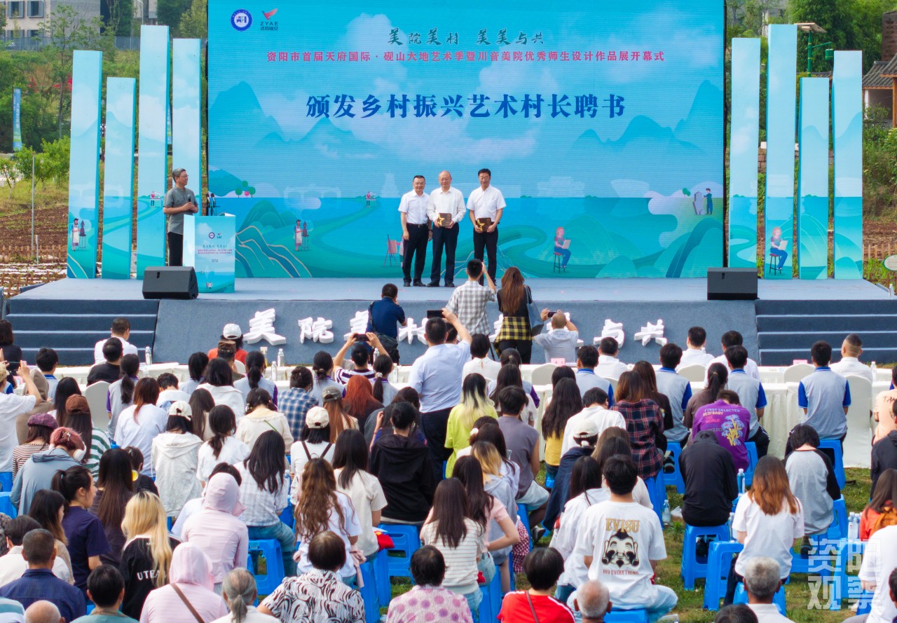 艺术季启幕现场,校地合作迎来升级──从单点艺术改造迈向“艺术—生态—产业”良性循环,推动“各美其美”向“美美与共”的乡村艺术共同体跃升。四川音乐学院成都美术学院党委书记贺阳、副院长牟文虎分别受聘为仁里村、红碑社区的“艺术村长”。四川音乐学院成都美术学院老师刘长青聘为资阳市临江镇乡村振兴艺术村长助理、总规划师。