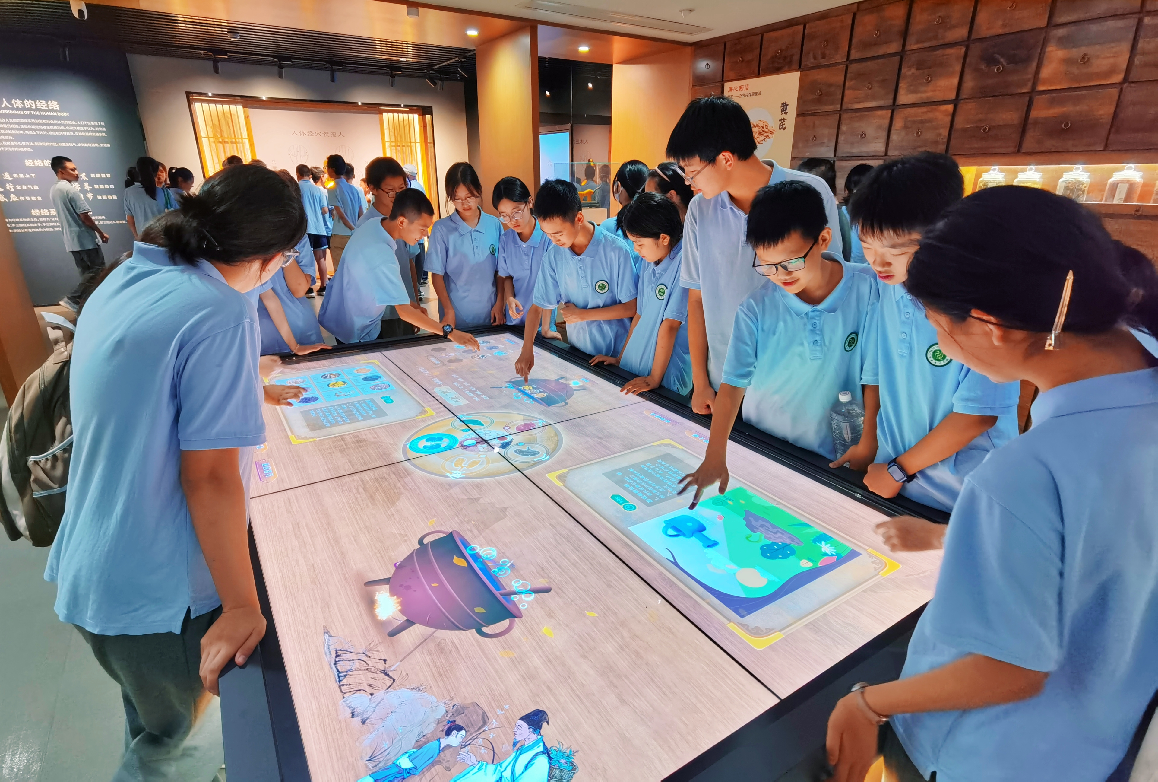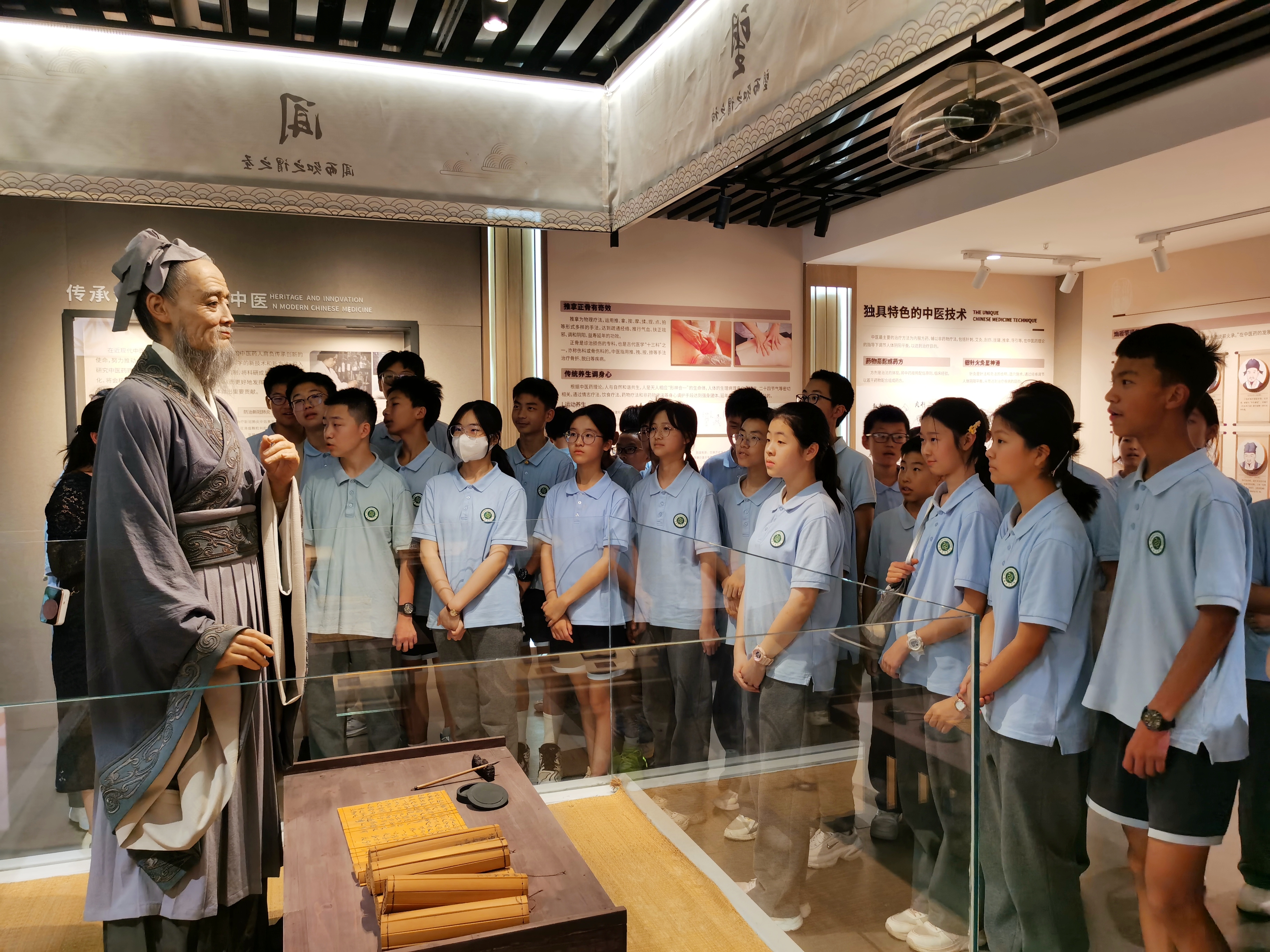 步入陈列馆,琳琅满目的中药材、各式中医药器具瞬间吸引了学生们的目光。从“望闻问切”的渊源到常见中草药功效,再到中医名家典故,学生们认真聆听、踊跃提问。通过了解川派中医发展脉络、辨识中药材、习练八段锦,他们在沉浸式体验中深切感受着中医药文化的博大精深与民族智慧。