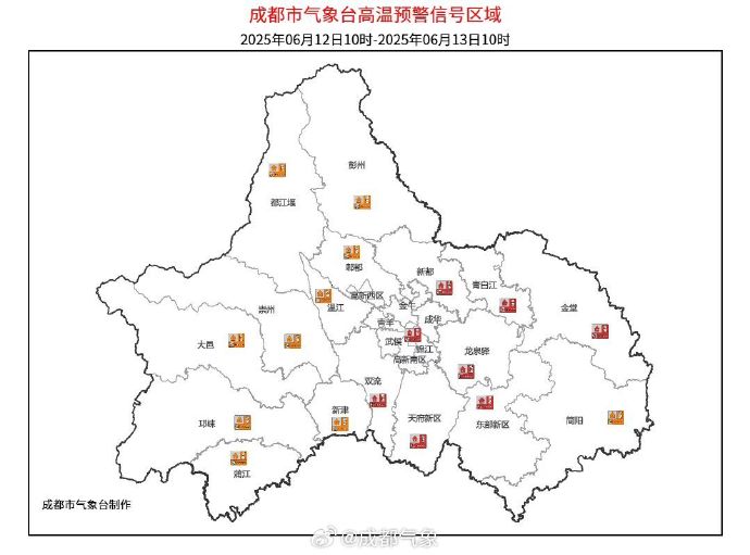 目前成都市金堂、新都、龙泉驿、双流、天府新区已发布高温红色预警信号,彭州、邛崃、郫都、蒲江、温江、都江堰、崇州、大邑、新津、简阳已发布高温橙色预警信号。