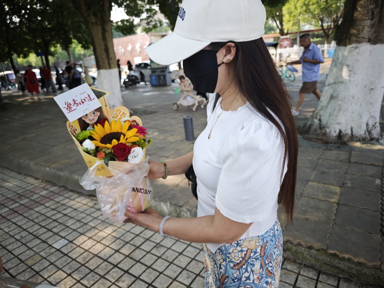 家长带着向日葵前来送考。