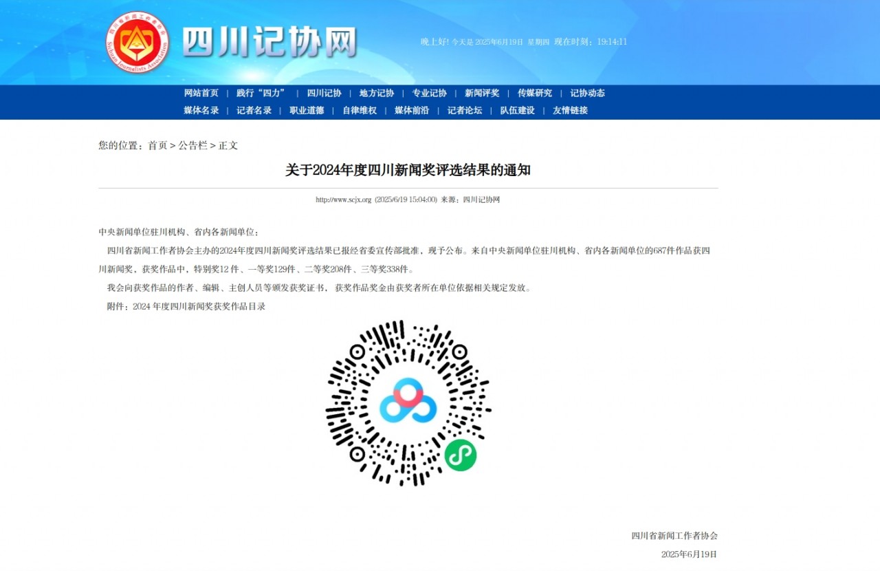 四川记协网发布《关于2024年度四川新闻奖评选结果的通知》截图。