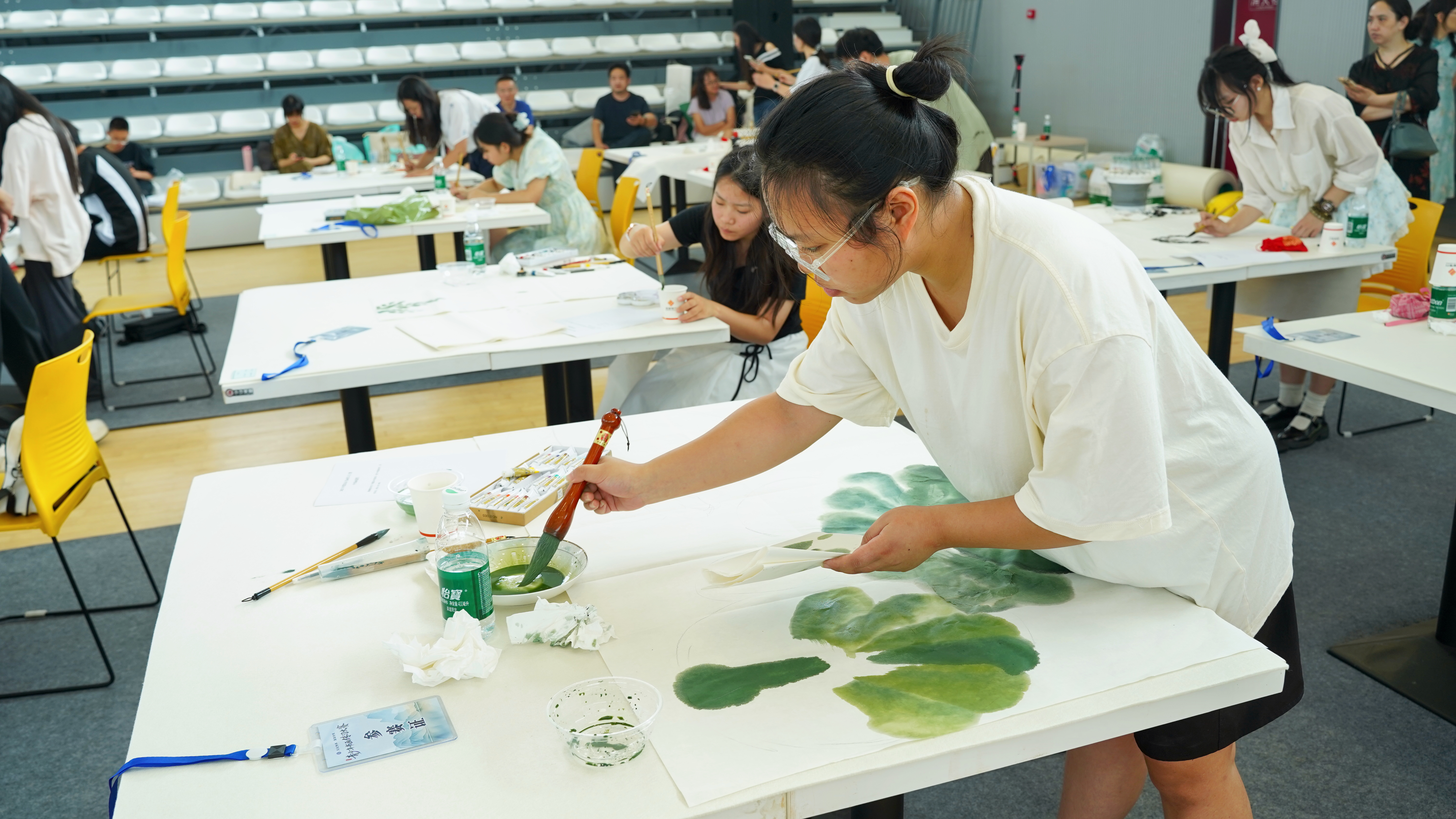 赛场一角,安岳中学美术教师吴娟正在静心等待同学们完成创作。“书法和国画都是中华优秀传统文化,是我们的国粹,希望同学们在大赛中心平气和、尽情展示自己。”在她看来,青少年书画传习大赛不仅是技艺比拼,更是文人精神的传递,同学们落笔的每个瞬间,都是在与千年文明对话。