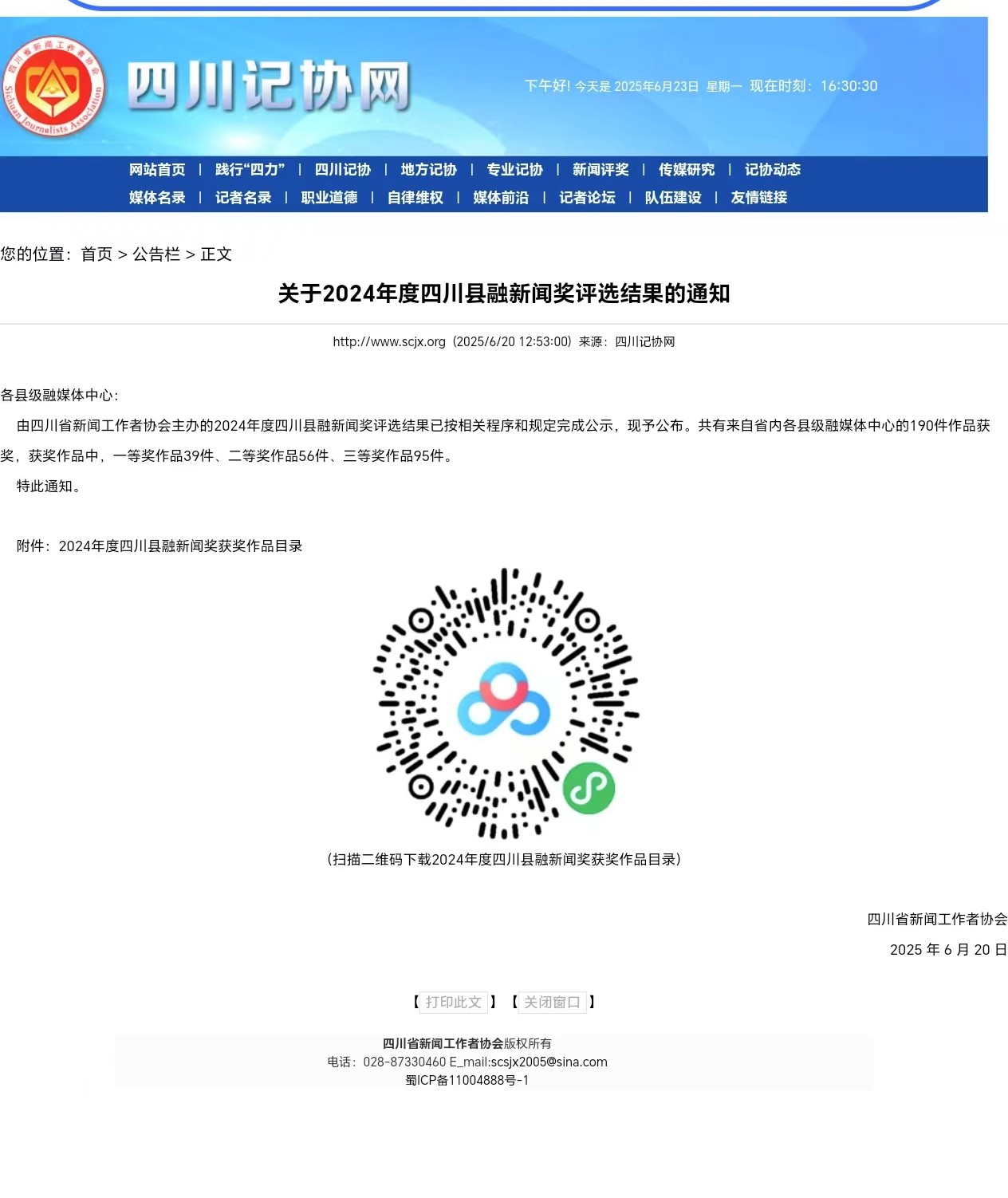 据了解,2024年度四川县融新闻奖评选工作,由四川省新闻工作者协会主办,共有来自省内各县级融媒体中心的190件作品获奖。获奖作品中,一等奖作品39件、二等奖作品56件、三等奖作品95件。