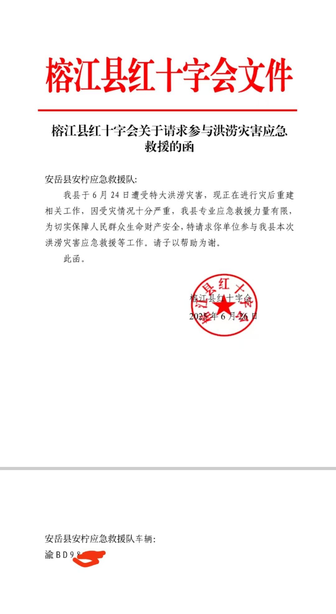 榕江县红十字会向安柠应急救援队发函请求支援。