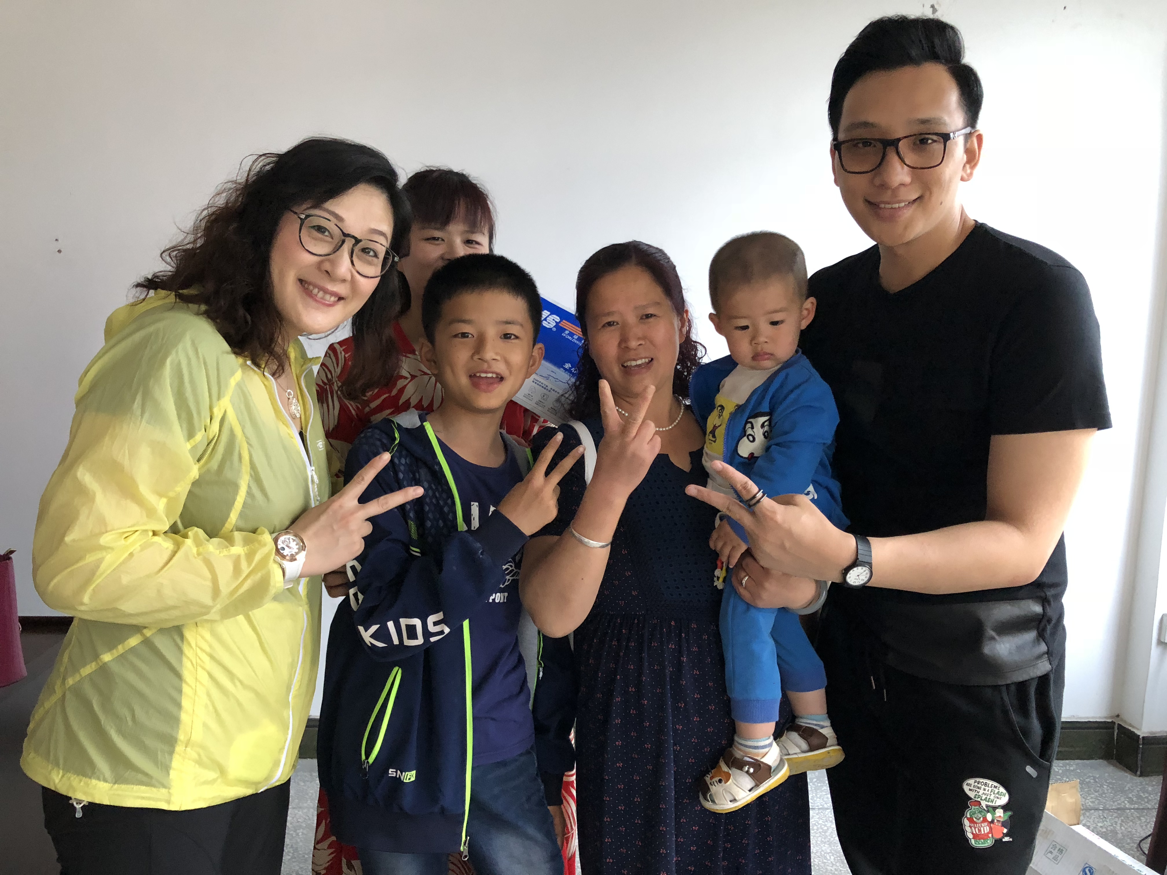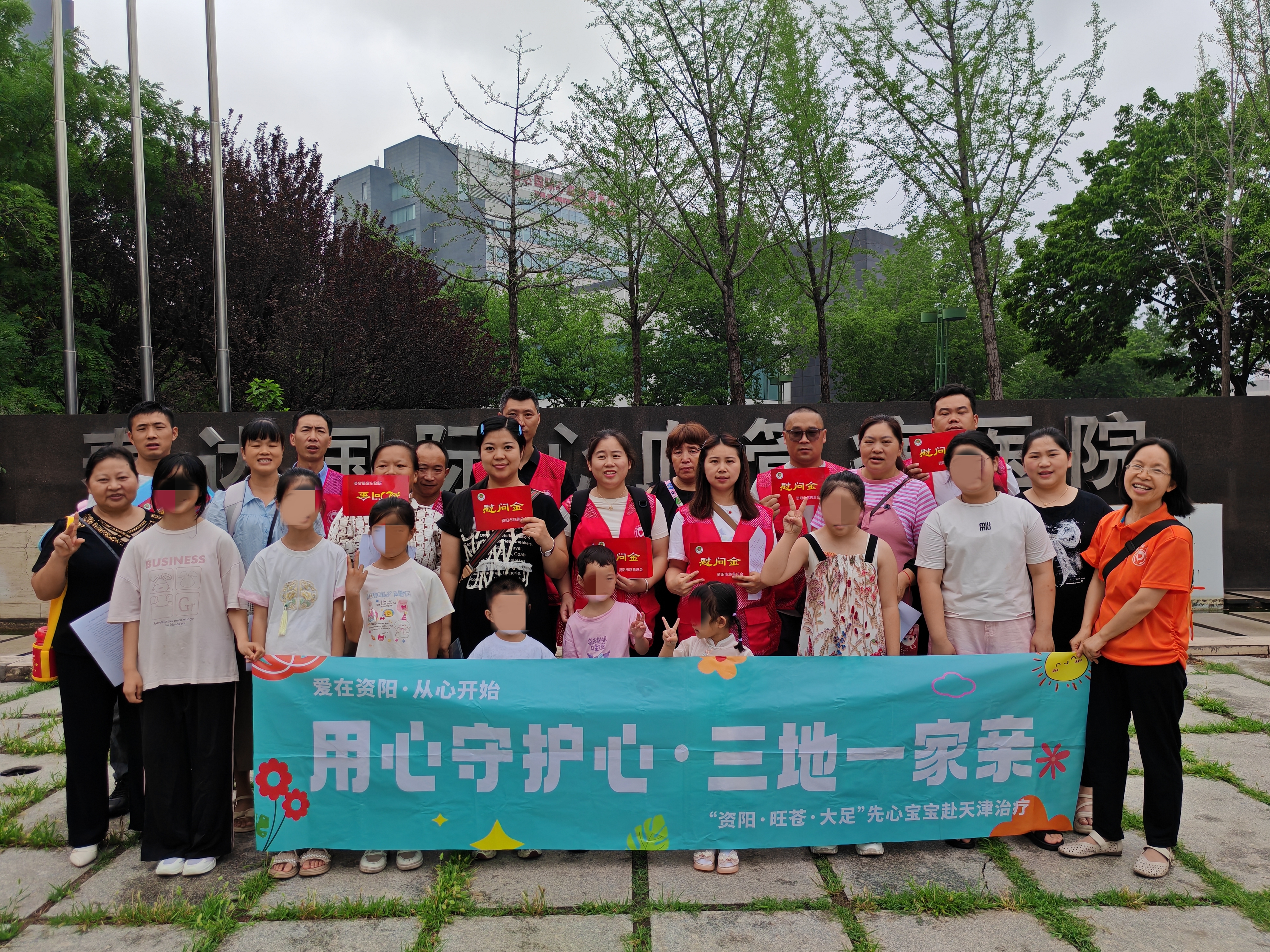 来自四川资阳、旺苍的8名先心病儿童和家长在医院门前集合。