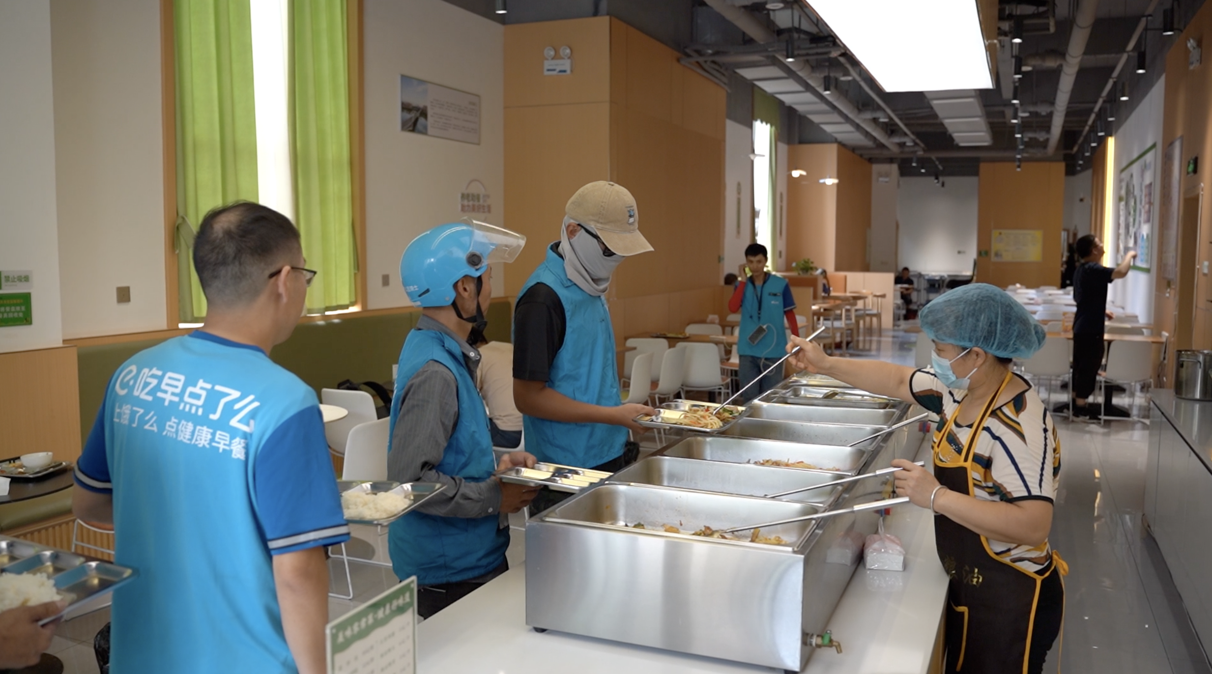 “以前午饭要么凑合啃冷面包,要么蹲路边吃盒饭。现在有地方坐,有热饭吃,还便宜。”骑手王宁边吃边说。食堂二楼是休息区,图书角、充电口、空调凉风习习。下午2点到4点相对清闲,王宁和几个同伴靠在椅子上,有人刷手机放松、有人翻书、有人低声交流接单趣事。