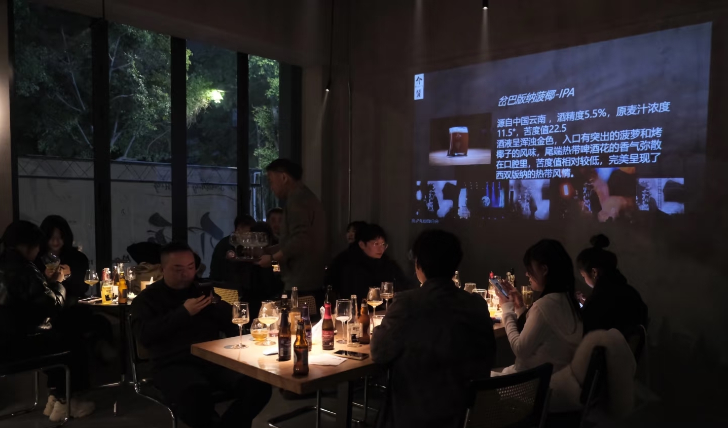 夜晚,暖黄的灯光在“介质”酒吧亮起。这里没有震耳的音乐,只有冰柜里琳琅满目的精酿啤酒瓶和人们低语的交谈声。它的诞生,正是“野杏”社区氛围结出的果实。