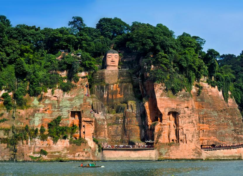 “天下山水之观在蜀,蜀之胜曰嘉州。州之胜曰凌云寺,寺之南山又其胜也。”乐山大佛坐落于凌云山的栖鸾峰,岷江、大渡河、青衣江三江汇流之处,与乐山中心城区隔江相望,山水相融、景城一体。乐山大佛开凿于公元713年(唐代开元元年),经三代人,历时九十年建成。乐山大佛,这座世界上最大的弥勒石刻造像壁立千仞、端坐三江,通高71米,头与山齐,素有“佛是一座山,山是一尊佛”的称誉。乐山大佛是古代治水安澜的创举,蕴含“天人合一”“因地制宜”的理念,见证着中华文明如江河般生生不息。乐山大佛遗产地面积18.46平方公里,以山、水、岛为代表的自然景观得天独厚,以儒释道、汉唐文化、弥勒文化为核心的人文资源博大精深。遗产地内现有各级文物保护单位和文物点47处,从先秦至明清,历史遗存星罗棋布,历千年而不绝,其中全国重点文物保护单位4处。遗产地内还有苏轼、黄庭坚等历代文人名士题咏碑刻200余处。