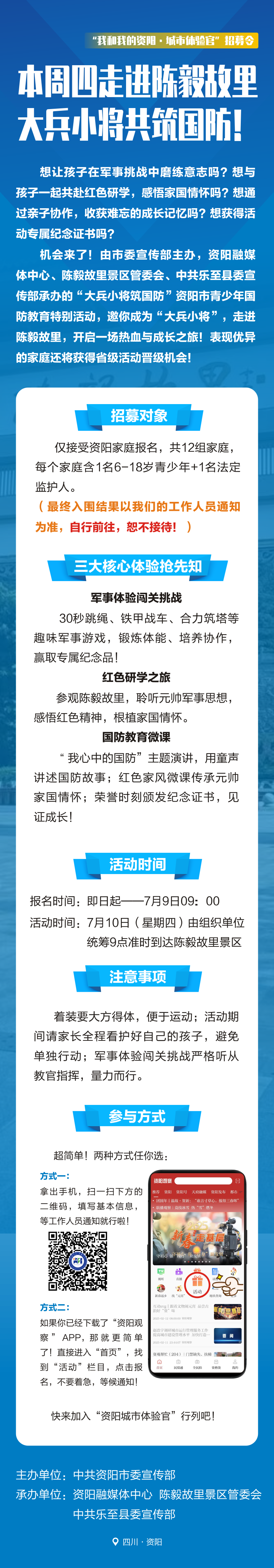 机会来了!由市委宣传部主办,资阳融媒体中心、陈毅故里景区管委会、中共乐至县委宣传部承办的“大兵小将筑国防”资阳市青少年国防教育特别活动,邀你成为“大兵小将”,走进陈毅故里,开启一场热血与成长之旅!表现优异的家庭还将获得省级活动晋级机会!