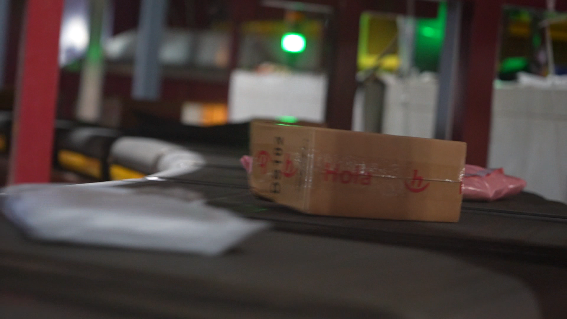 走进分拣区,记者看到,分拣人员只需将包裹放在传送带上,系统便按照既定程序将其传送到扫描区域。经过扫描,包裹如同被赋予了“智慧大脑”,当到达所属位置时,便会自动滑到相应的分拣格口。
