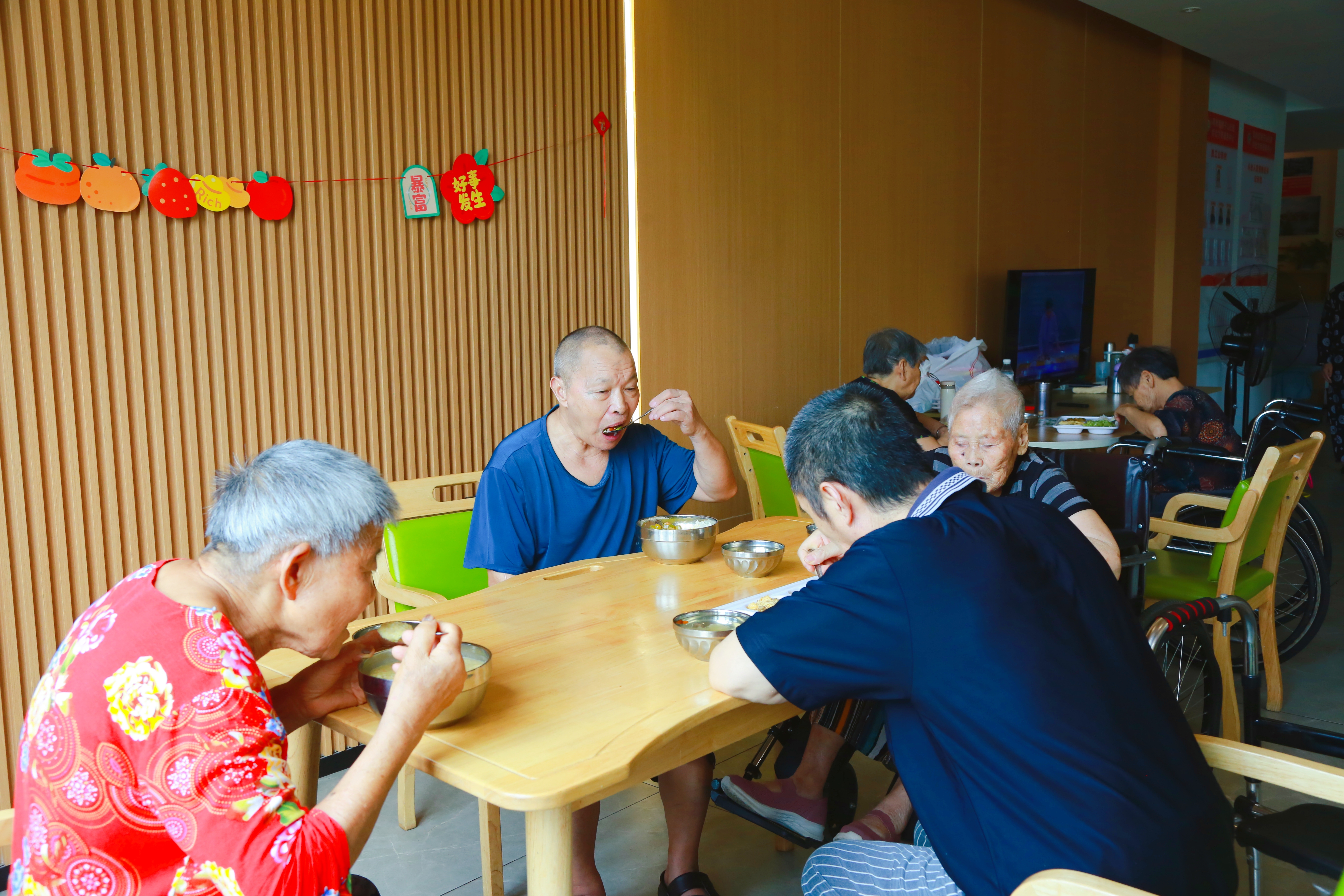老人在助餐点快乐就餐。