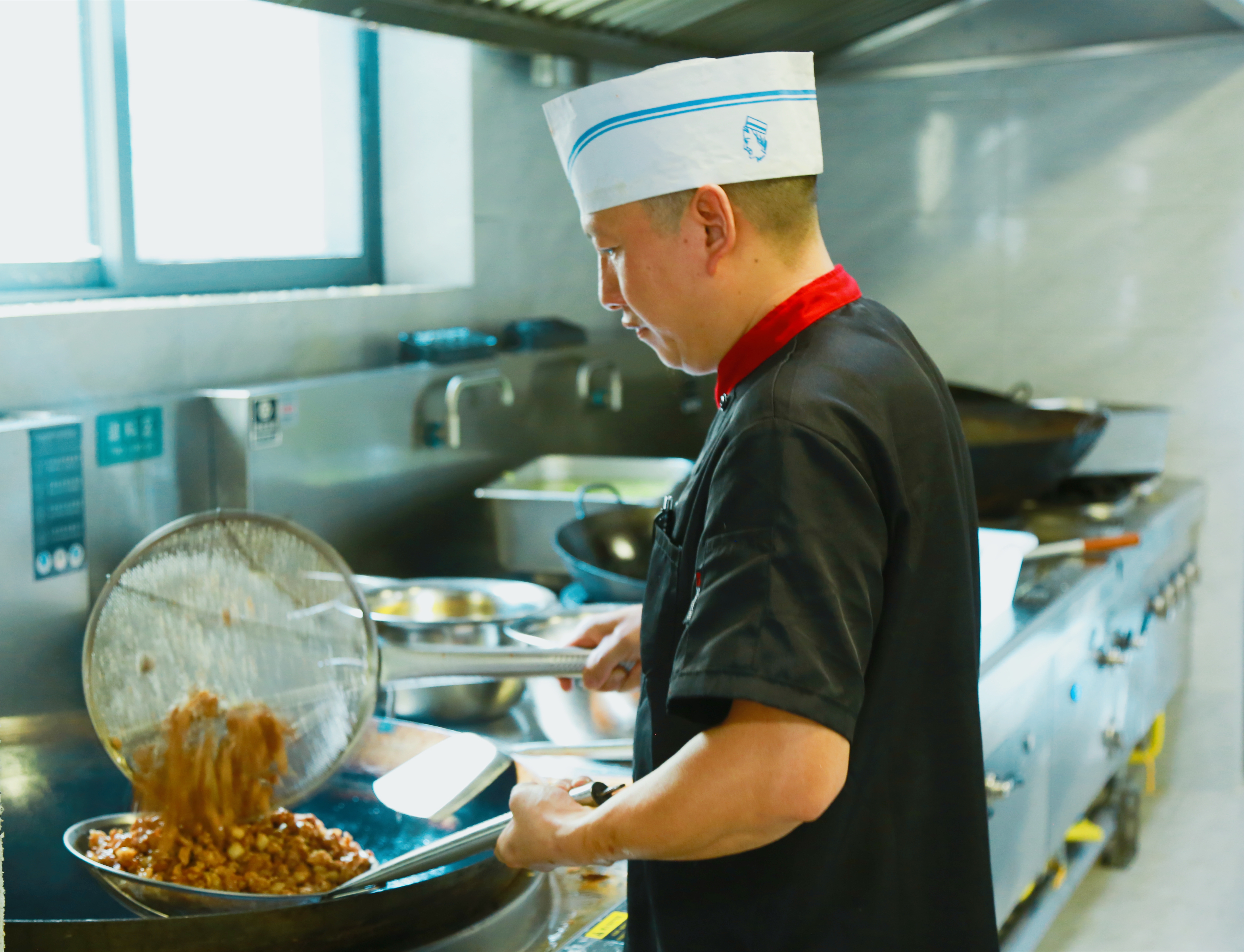 中央厨房师傅正在烹饪餐食。
