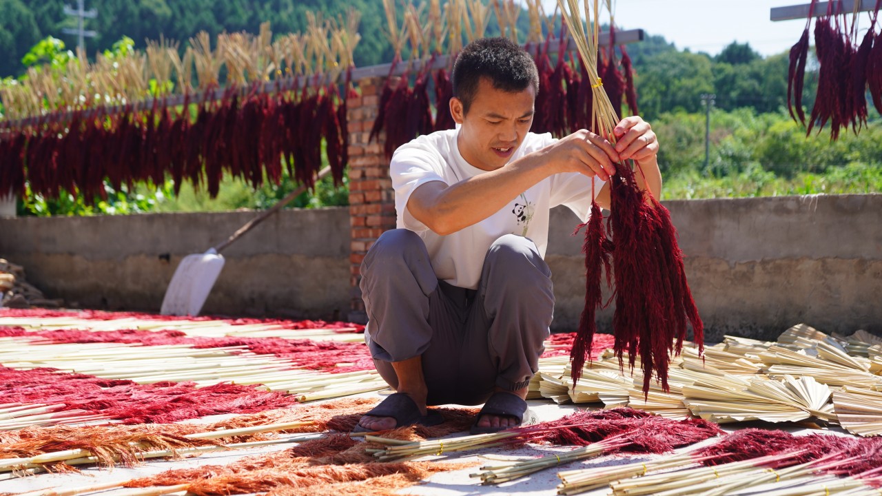 而在板房外的一片空地上,正上演着一场“阳光魔法”,五颜六色的干花枝被整齐摆放在烈日下晒“日光浴”。“这是定型的最后一步,得晒足三天,既保证干透,又能留住自然的韧劲。”何花擦了擦额角的汗,指着正在晾晒的材料介绍,“你看这狗尾巴草,刚收来时蔫头耷脑,处理后反倒有了蓬松的灵气。”曾经有批货急着赶工,晒了两天就打包,结果客户收到全蔫了,夫妻俩自掏腰包赔了钱,从此再不敢马虎。