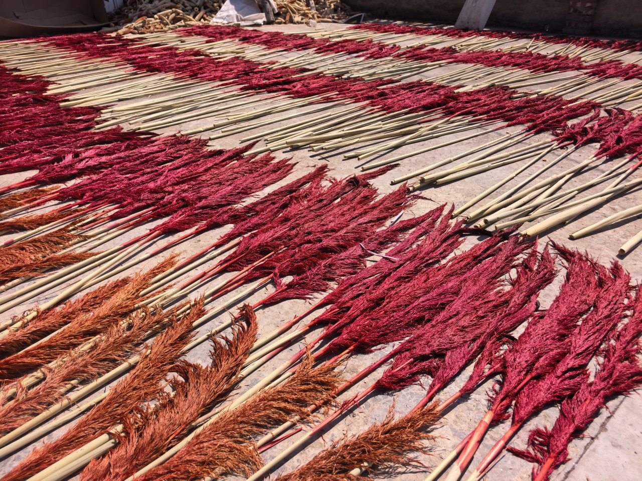 在板房内的货架上,被染成彩色的芦苇捆成圆柱形,仿真花与干枝错落搭配,等待打包的包裹堆成小山。李新国正用胶带固定纸箱,双手被深浅不一的染料浸出红色印记。“这是‘财富密码’,洗不掉才好呢。”他拿起一束染成渐变蓝的芦苇笑着晃了晃手:“这是给辽宁那边一家婚纱店做的,配白裙子拍照,美得很!”