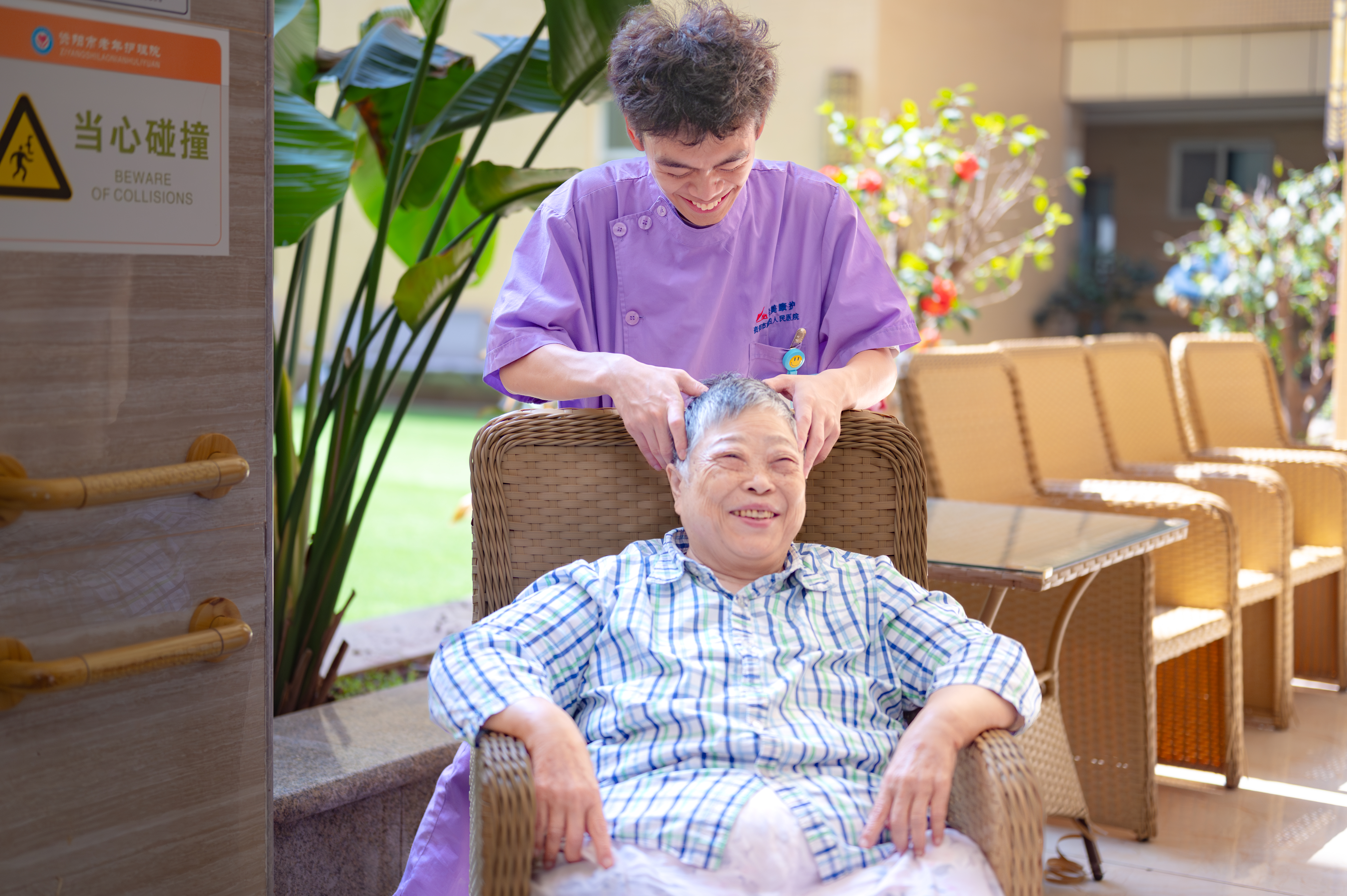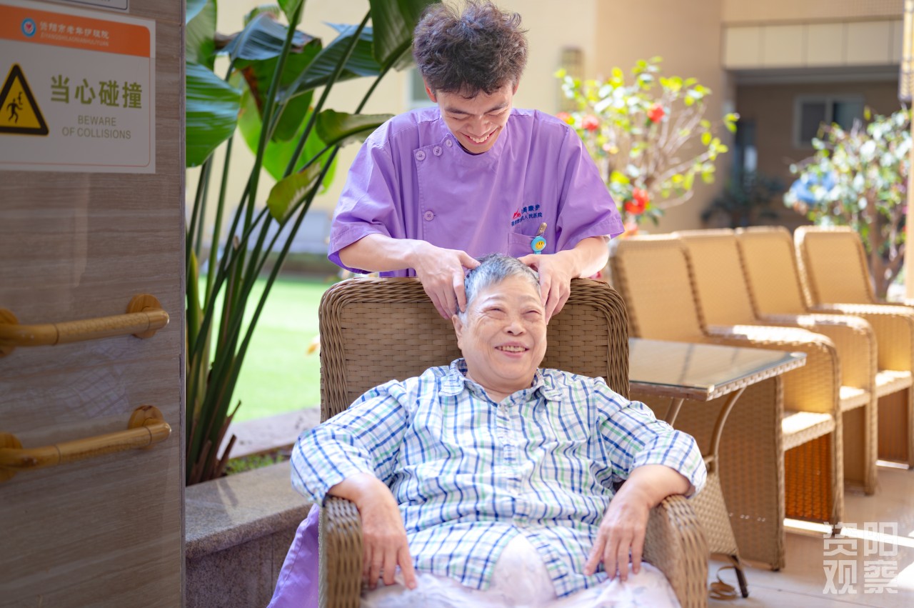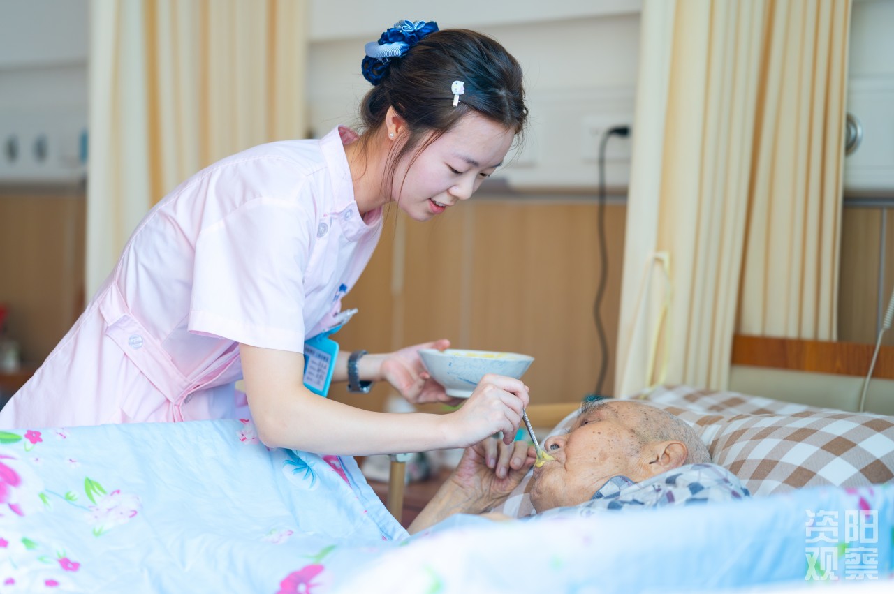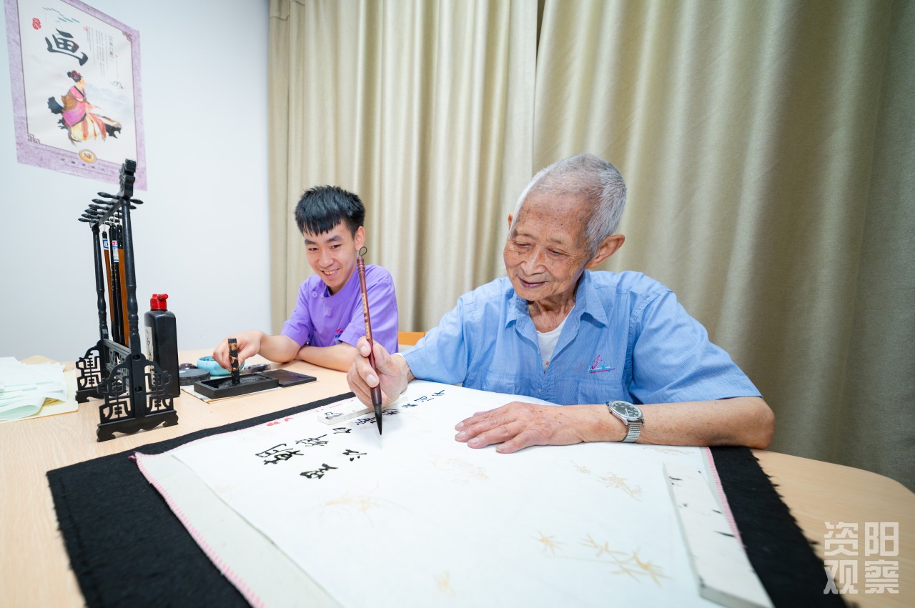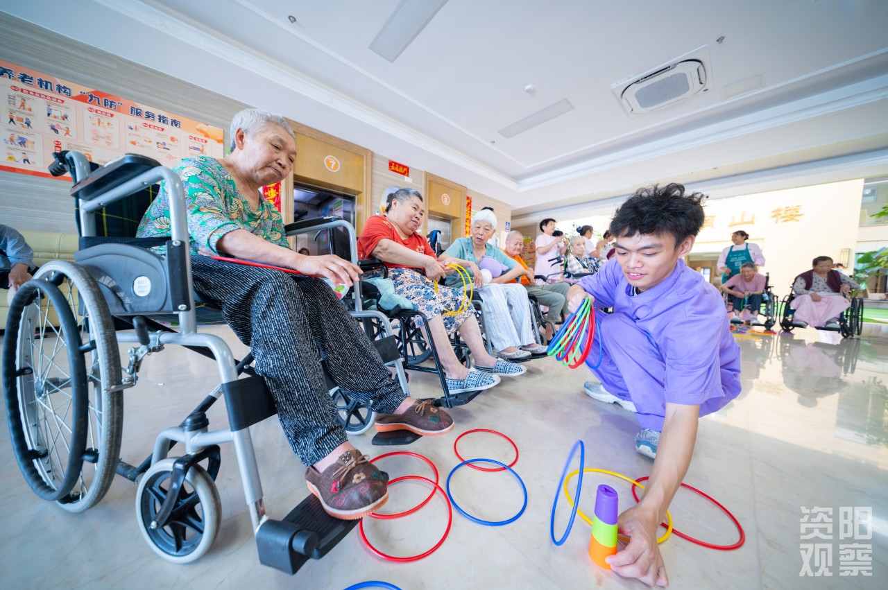 四楼,廖锦轩轻扶96岁的闫明清走向书案,铺纸研墨间,聆听“一撇如刀,一点如桃”的书法真谛;三楼,姚蝶一边利落晾衣,一边与老人闲话家常;二楼失能区,李思琪为91岁的汤素华奶奶翻身,动作轻柔如呵护婴孩;一楼康复区,刘天赐穿梭于轮椅间,仔细调紧每位老人的安全带,用充满感染力的声音,带领“80+”“90+”的“老顽童”们投入套圈游戏。这,便是全国老龄化程度第二、四川老龄化程度第一的资阳,养老护理的青春图景。
