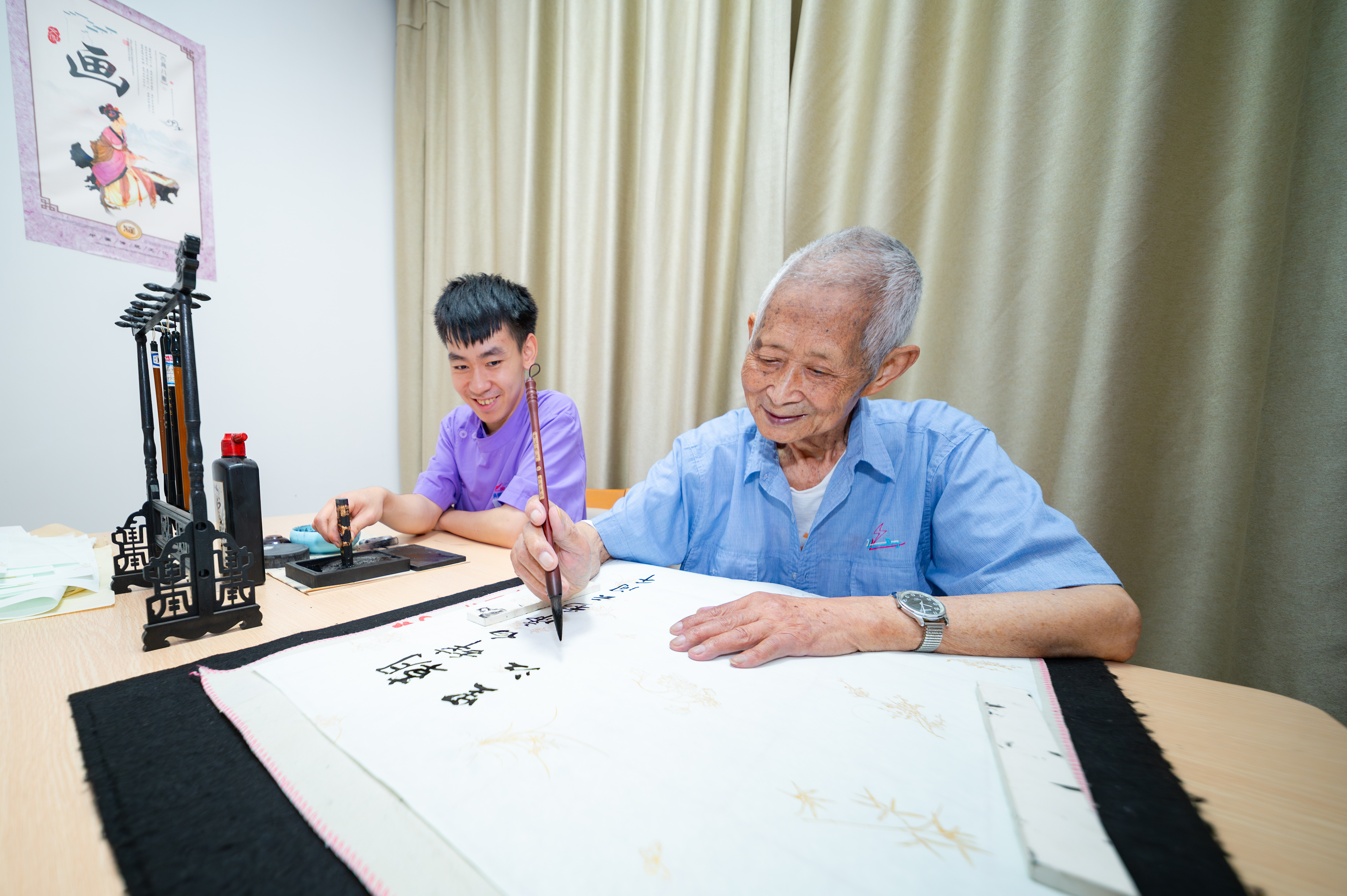 廖锦轩陪96岁的闫明清爷爷写书法。
