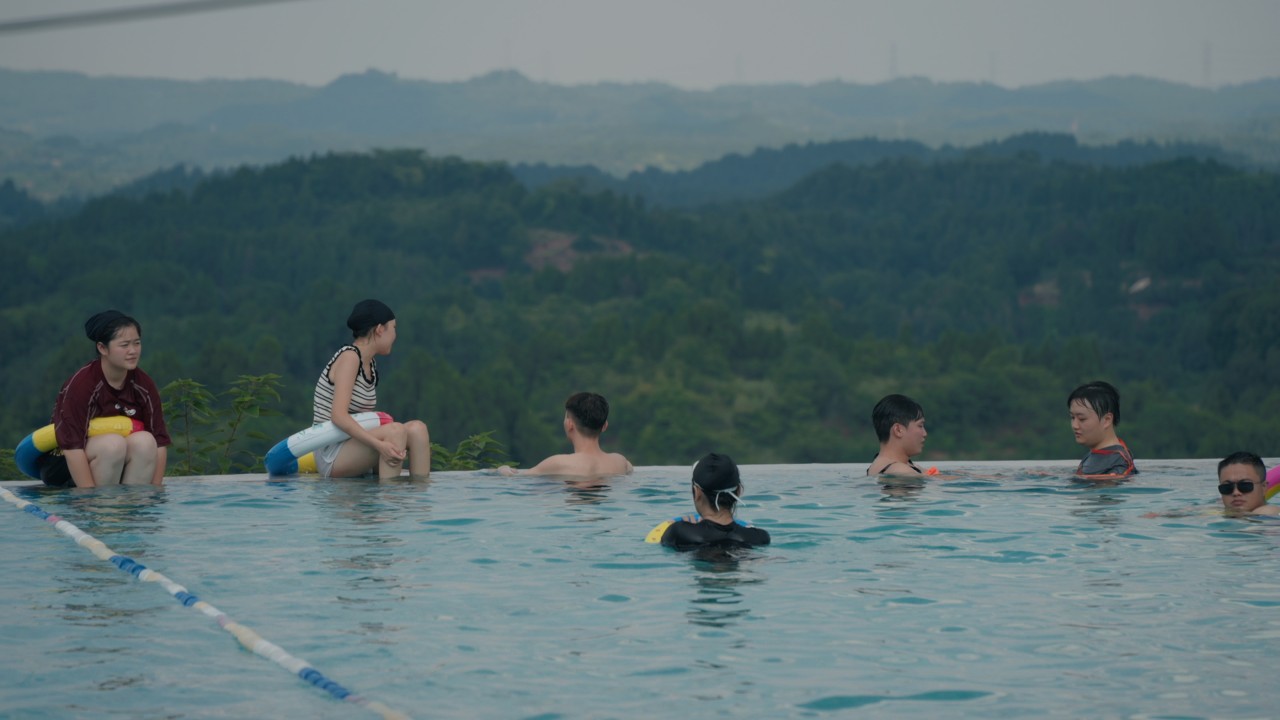 伴随着水花四溅声,游客们纷纷扎进无边泳池,或是在玩闹间抛开烦恼,或是泡在凉水中放松身心。这片泳池不仅是游客们降暑神器,也是美景的一部分,它像天空和山川的镜子,映照出云彩和天光交织的画面,更与山川巧妙融合,构成独具特色的自然风格。玩水玩累了,不少游客留宿于此,欣赏山间美景的同时,也能在林间小屋内感受山野来风。
