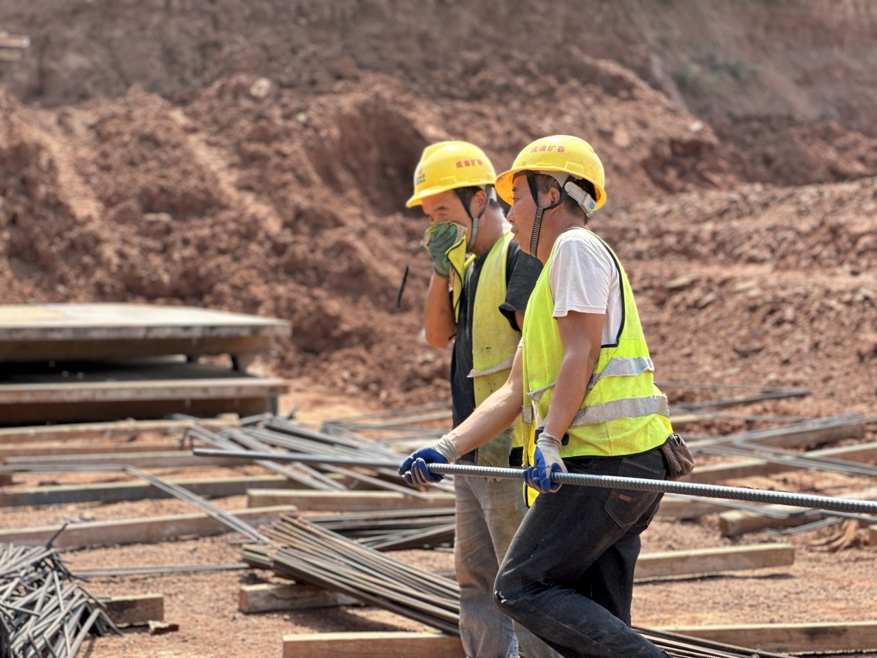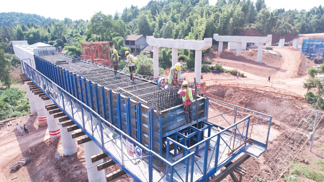 建设现场,巨大的吊臂在成资渝、遂资眉高速上空缓缓移动。工人在离地20米的支架上绑扎钢筋,旁边就是高速上呼啸而过的车流。