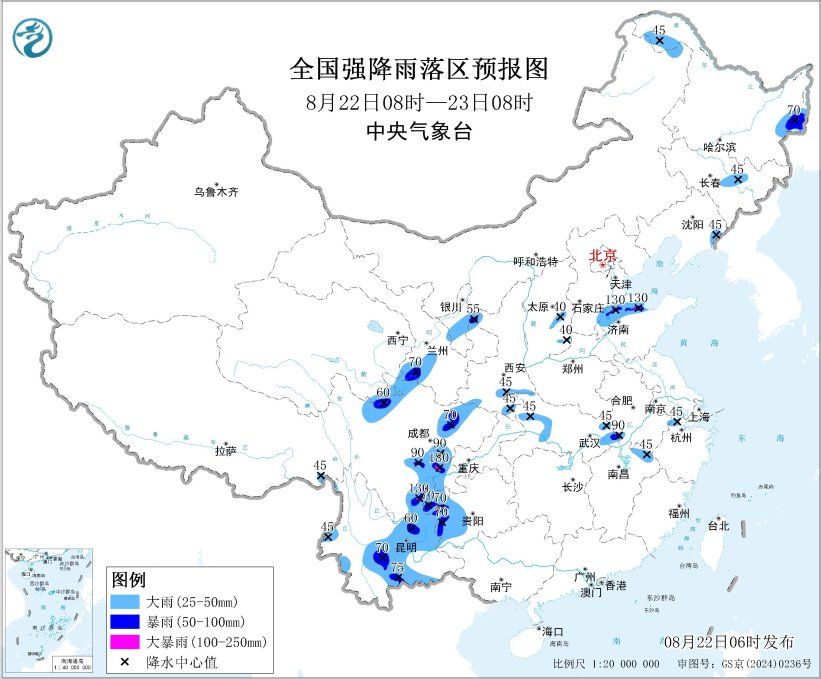 预计,8月22日08时至23日08时,黑龙江西北部和东部、吉林中部、辽宁东部、青海东南部、甘肃中南部、宁夏中部、陕西南部、山西东部、山东北部、湖北东部和西部、江西北部、川西高原北部、四川盆地中西部和南部、贵州西部、云南中东部和西南部等地部分地区有大到暴雨,其中,山东北部、四川盆地南部、云南东北部等地局地有大暴雨(100~180毫米)。上述部分地区伴有短时强降水(最大小时降雨量20~50毫米,局地可超过70毫米),局地有雷暴大风等强对流天气。