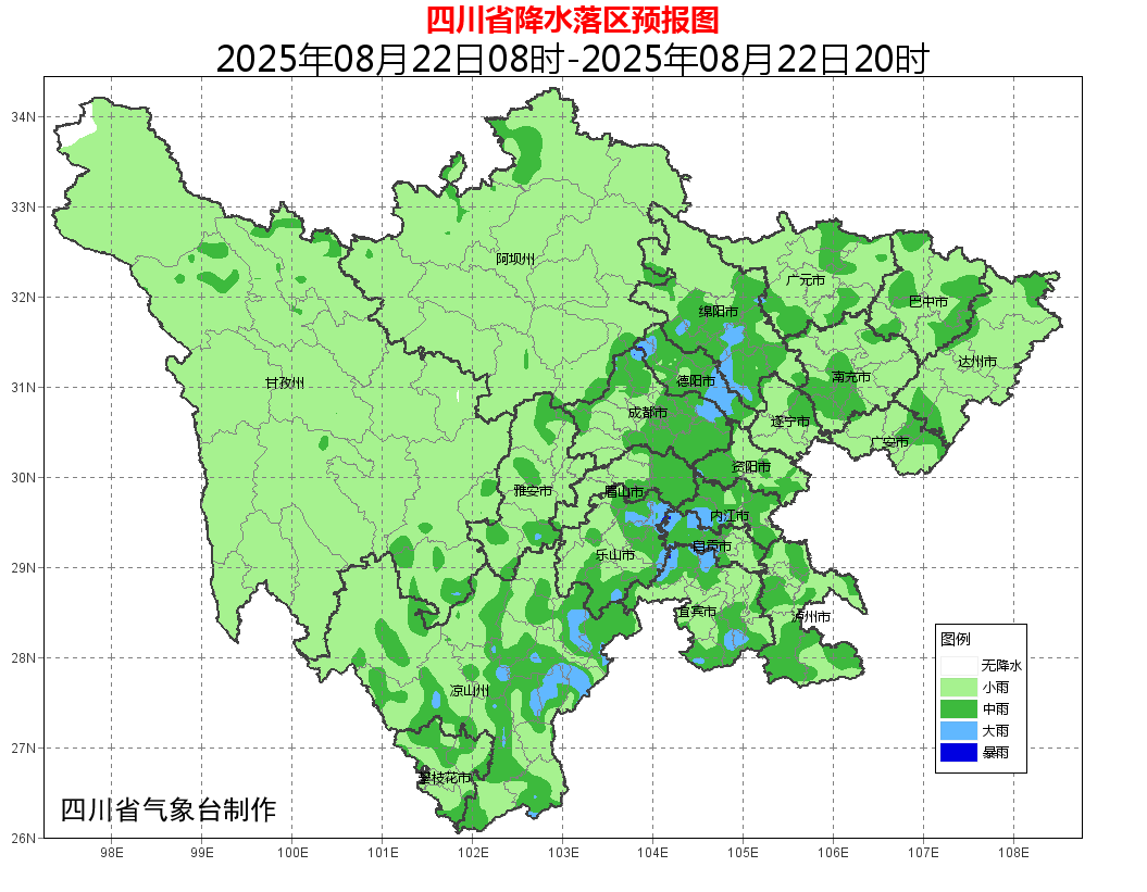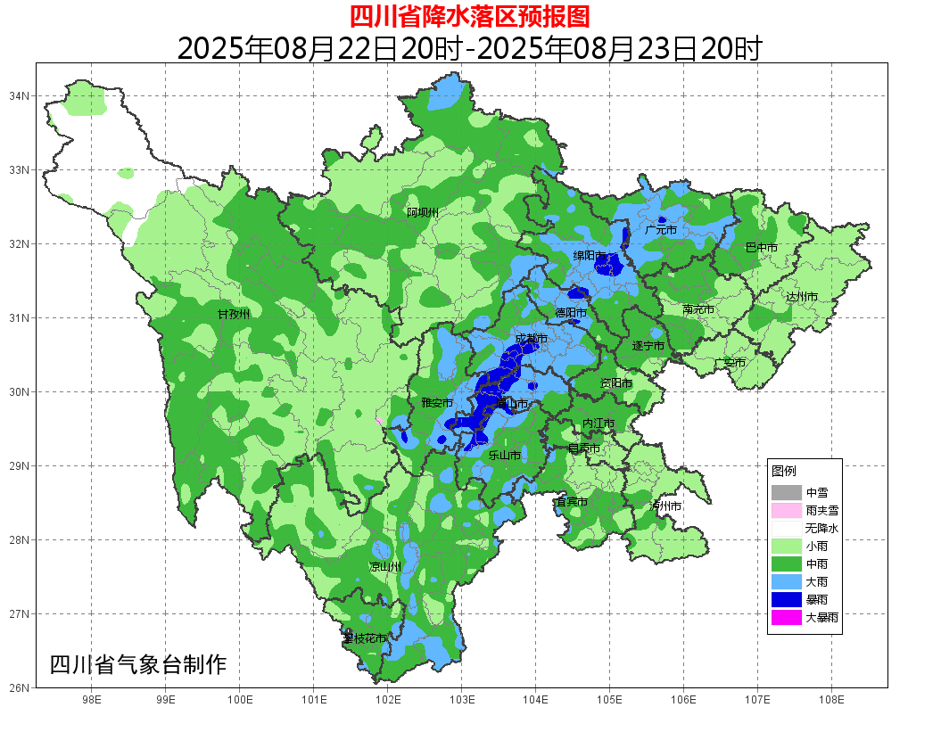 22日晚上到23日白天:盆地大部阴天间多云有小到中雨,其中广元、绵阳、德阳、成都、雅安、眉山、乐山7市的部分地方有大雨到暴雨;川西高原大部和攀西地区阴天间多云有雷雨或阵雨,雨量小到中雨,局部大雨。