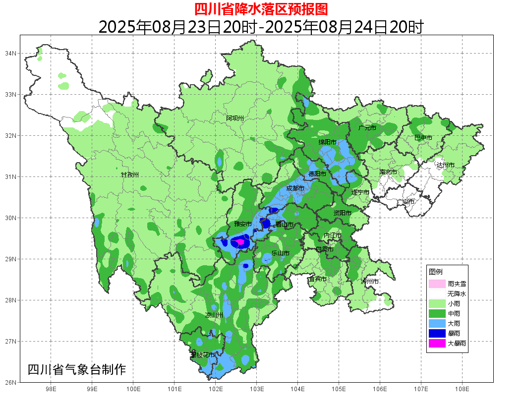 23日晚上到24日白天:盆地大部阴天间多云有小到中雨,其中绵阳、德阳、成都、雅安、眉山、乐山6市的部分地方有大雨,局地暴雨,个别大暴雨;川西高原大部和攀西地区多云间阴有雷雨或阵雨,其中川西高原东部南部和攀西地区的部分地方有中到大雨,个别暴雨。