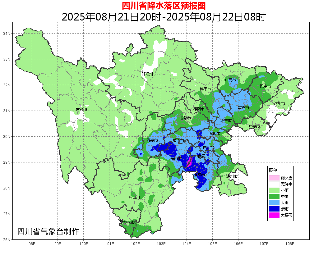 四川省气象台8月21日15时50分继续发布暴雨蓝色预警:8月21日20时到22日20时:乐山、眉山、宜宾、雅安、内江、自贡6市,资阳、南充2市西部,绵阳、德阳、成都3市的部分地方有暴雨(雨量50~90毫米),局部大暴雨(雨量180~220毫米),最大小时雨强40~80毫米,并伴有短时雷雨大风。另外凉山州东部南部和甘孜州东部有大雨到暴雨(雨量30~70毫米)。