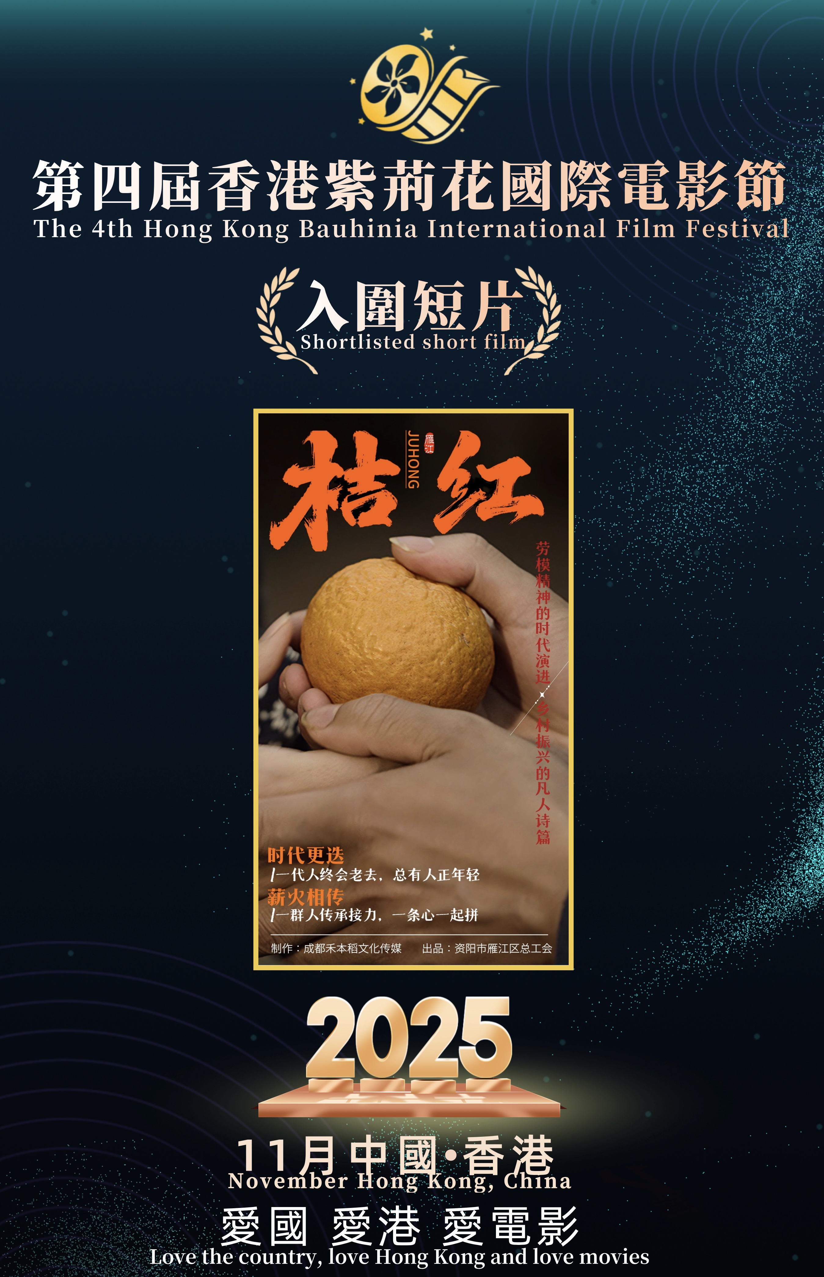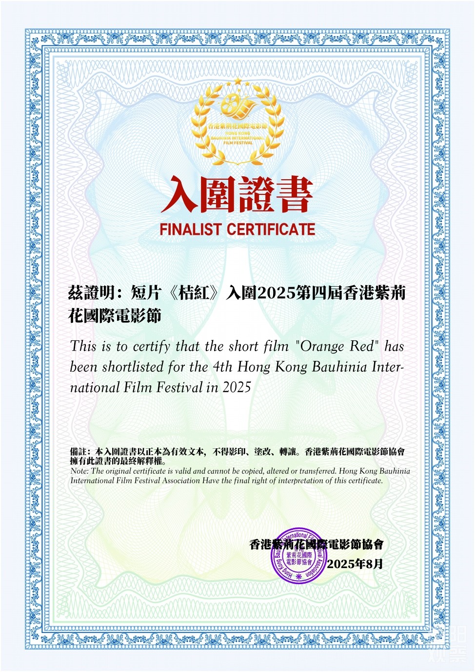 据悉,“香港紫荆花国际电影节”以“爱国、爱港、爱电影”为核心理念,聚焦发掘具有文化深度与创新精神的中小成本影片。《桔红》能够在众多参选作品中脱颖而出,入围短片竞赛单元,表明其艺术表达和主题内容获得了专业认可。