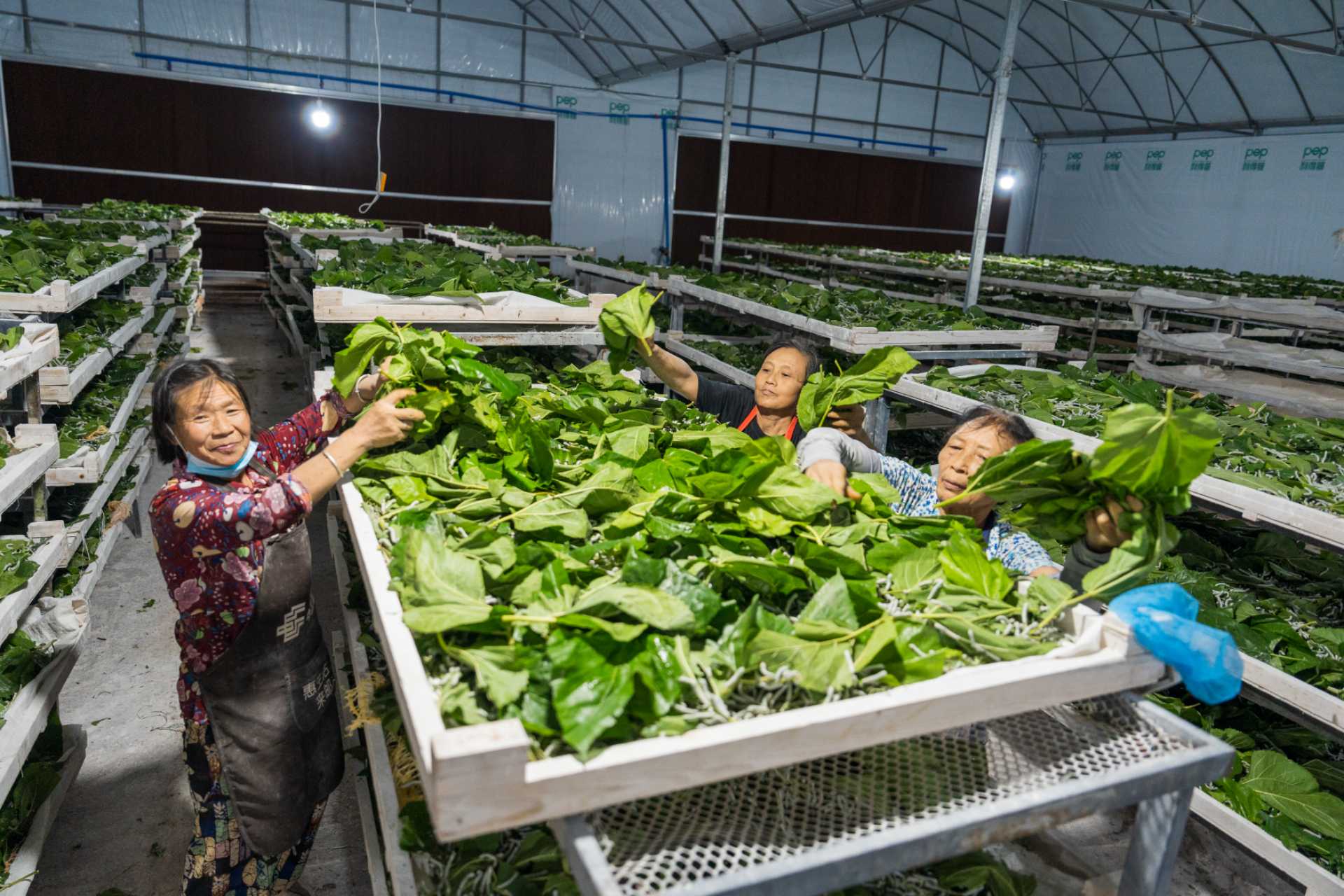村民们正在投喂蚕宝宝。