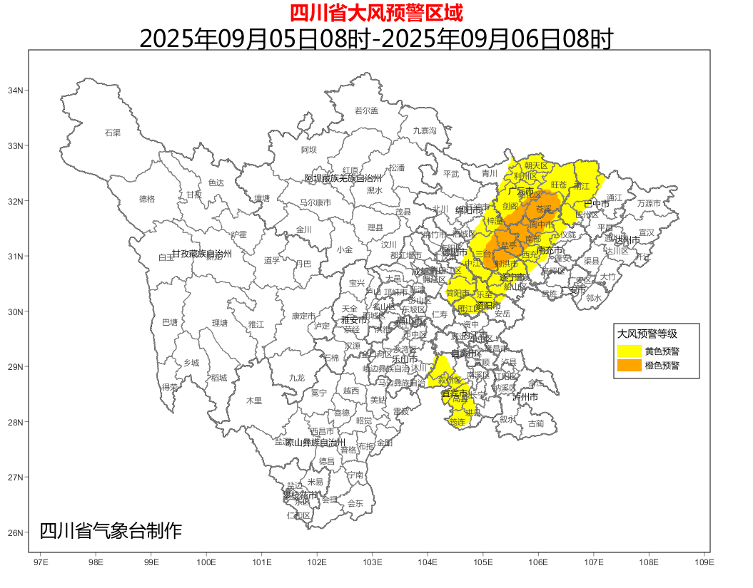 四川省气象台9月5日08时00分发布大风黄色预警:受冷空气影响,5日08时到6日08时,盆地普遍有4~6级风,其中广元,绵阳、德阳、成都3市东部,资阳、遂宁、南充、巴中、宜宾5市西部有6-8级风,局部风力可达9级或以上。