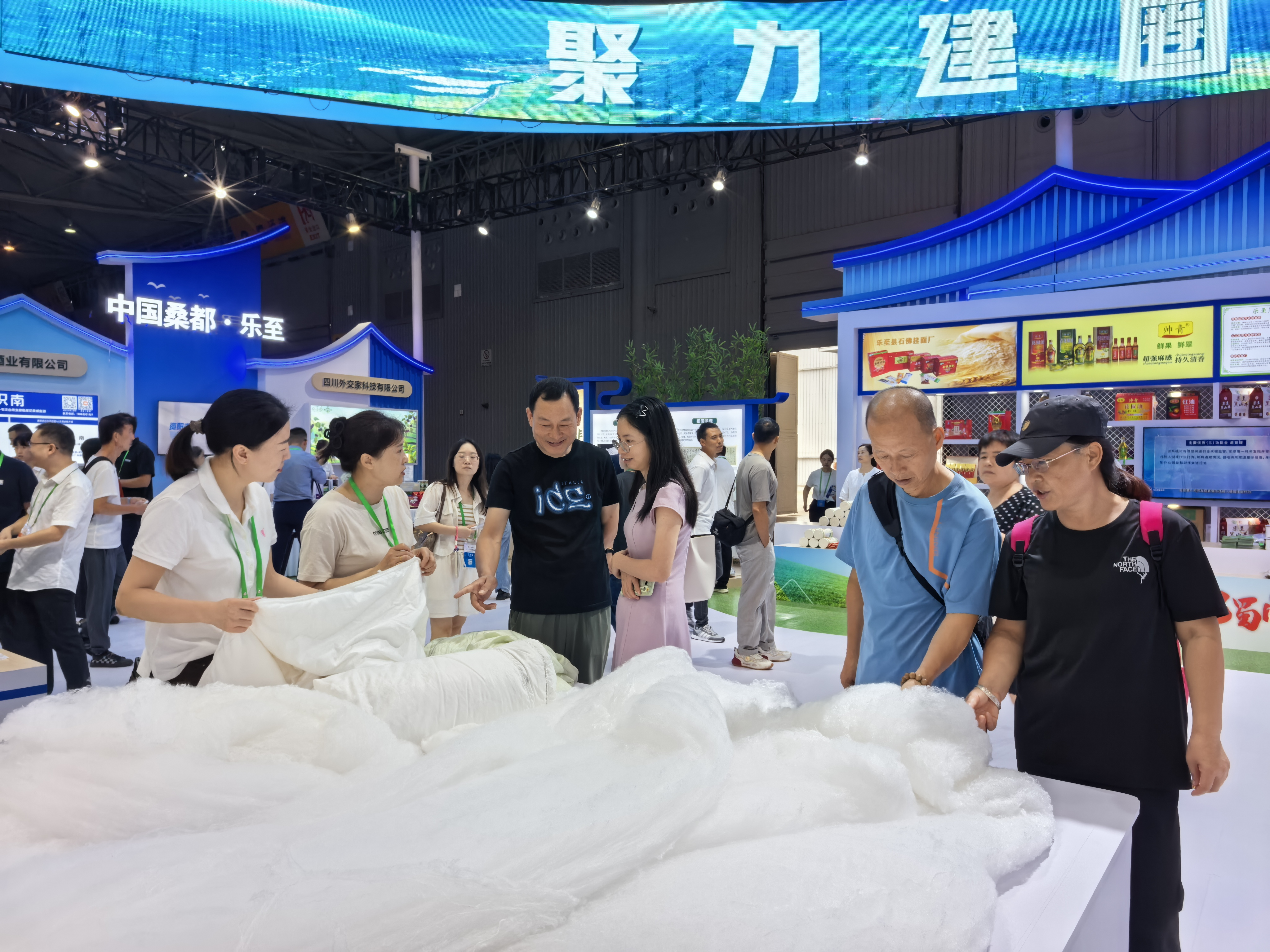 游客在挑选乐至桑蚕丝被。