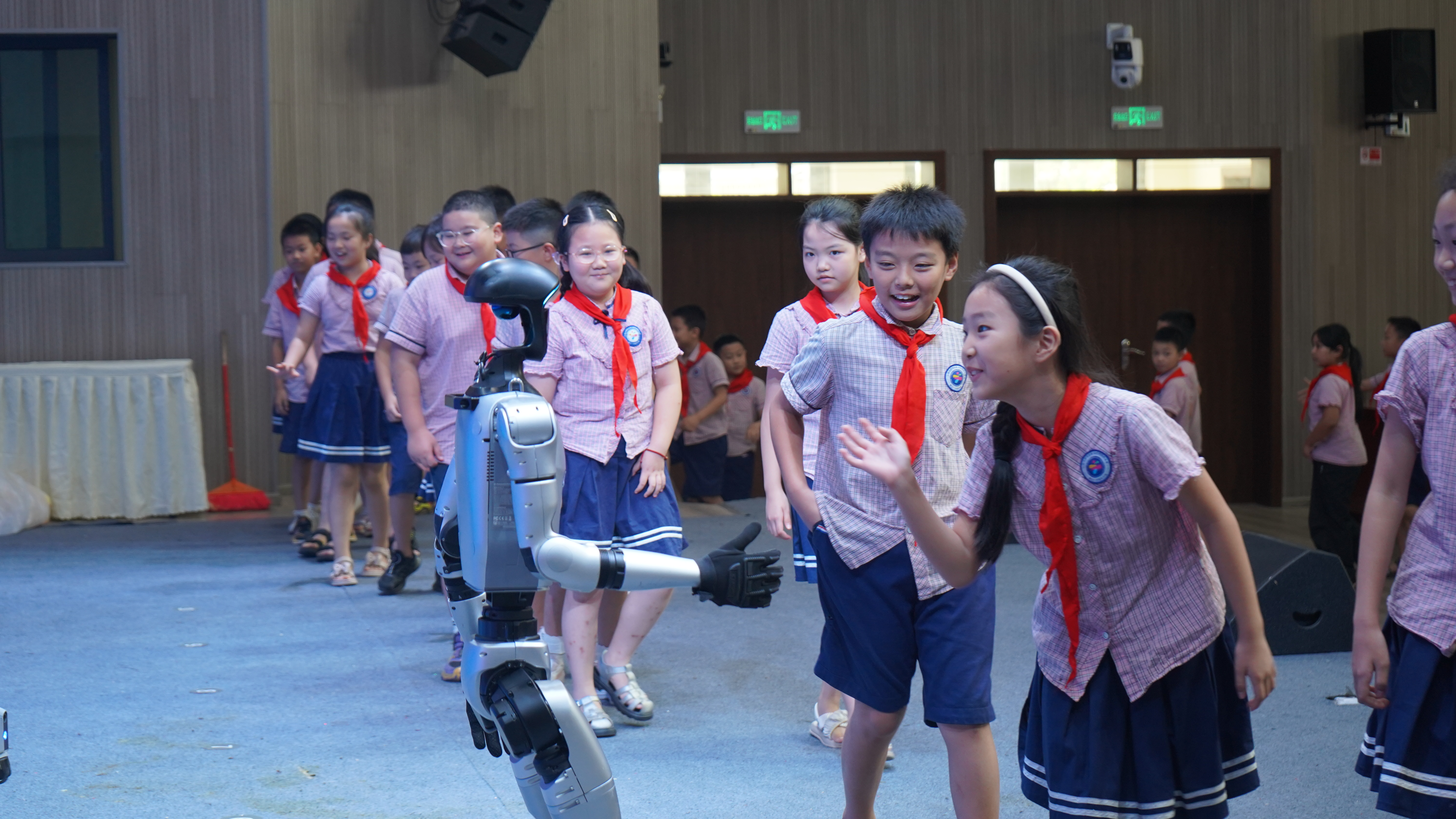 最让孩子们沸腾的,是机器人与机器狗的压轴表演。机械臂灵活挥手,机器狗稳稳弹跳、直立行走。学生们纷纷围拢上前,有的忍不住伸手与机器人“握手”,欢呼声几乎淹没整个礼堂。“老师布置了作文,今天我就要写这只厉害的机器狗!”学生黄诗鳗眼神里满是兴奋。