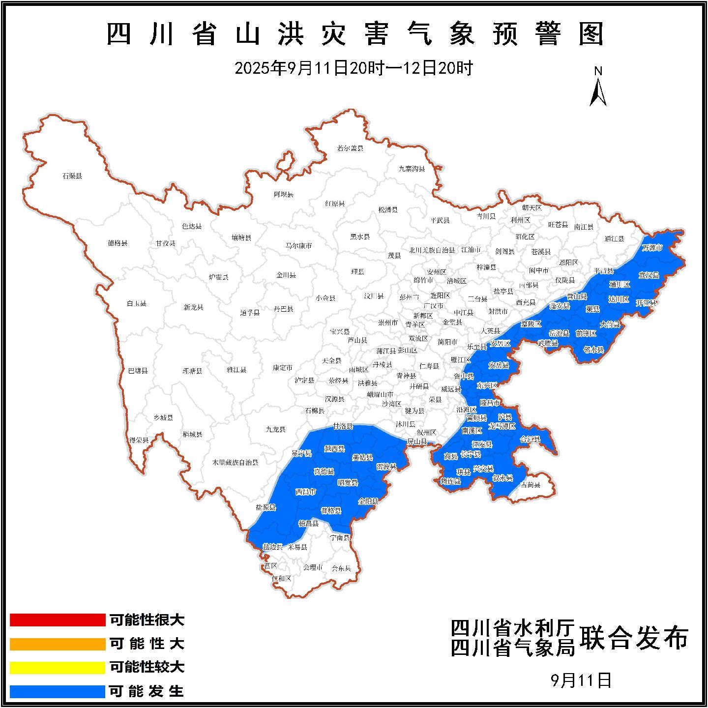 9月11日17时,四川省水利厅、四川省气象局联合发布山洪灾害蓝色预警,11日20时至12日20时,内江市东兴、隆昌、市中区、资中、威远,广安市广安、邻水、前锋、岳池、华蓥、武胜,泸州市纳溪、泸县、龙马潭、合江、江阳、叙永、古蔺,达州市大竹、开江、达川、渠县、通川、宣汉、万源,资阳市安岳、乐至、雁江,宜宾市江安、兴文、南溪、筠连、珙县、长宁、高县、屏山、翠屏、叙州,遂宁市安居、船山、蓬溪,自贡市富顺、大安、沿滩,南充市高坪、嘉陵、营山、蓬安、顺庆,凉山州雷波、越西、美姑、西昌、喜德、冕宁、甘洛、盐源、昭觉、布拖、金阳、德昌、宁南、普格,攀枝花市盐边、米易,乐山市马边、峨边,巴中市平昌,雅安市石棉等14个市(州)69个县(市、区)可能发生山洪灾害。