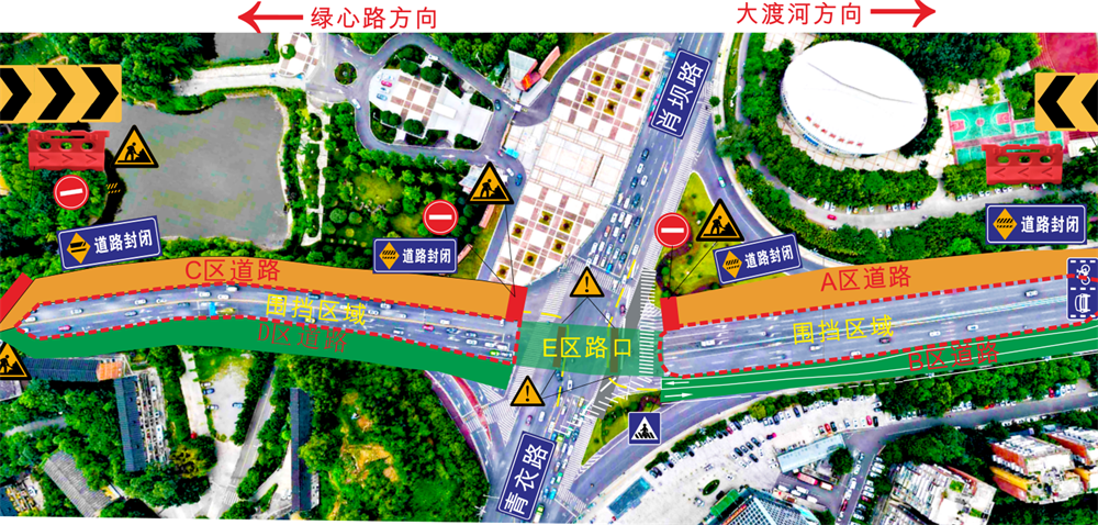 第二部分(2025年11月5日—2025年11月12日):绿心路一侧临时交通管制,进行预制小箱梁吊装施工。管制期间,C区(绿心路进城方向)将进行封闭,禁止车辆经绿心路往乐山广场方向行驶,绿心路出城方向车辆不受影响。