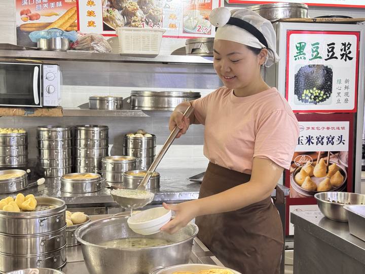 英语学习也在深入乐山的市井街巷。在城区的一家早餐店里,包子店老板杨倩熟练自信地用英语介绍着乐山特色早餐。蒸腾的热气中,透出乐山市民最本真的烟火气。