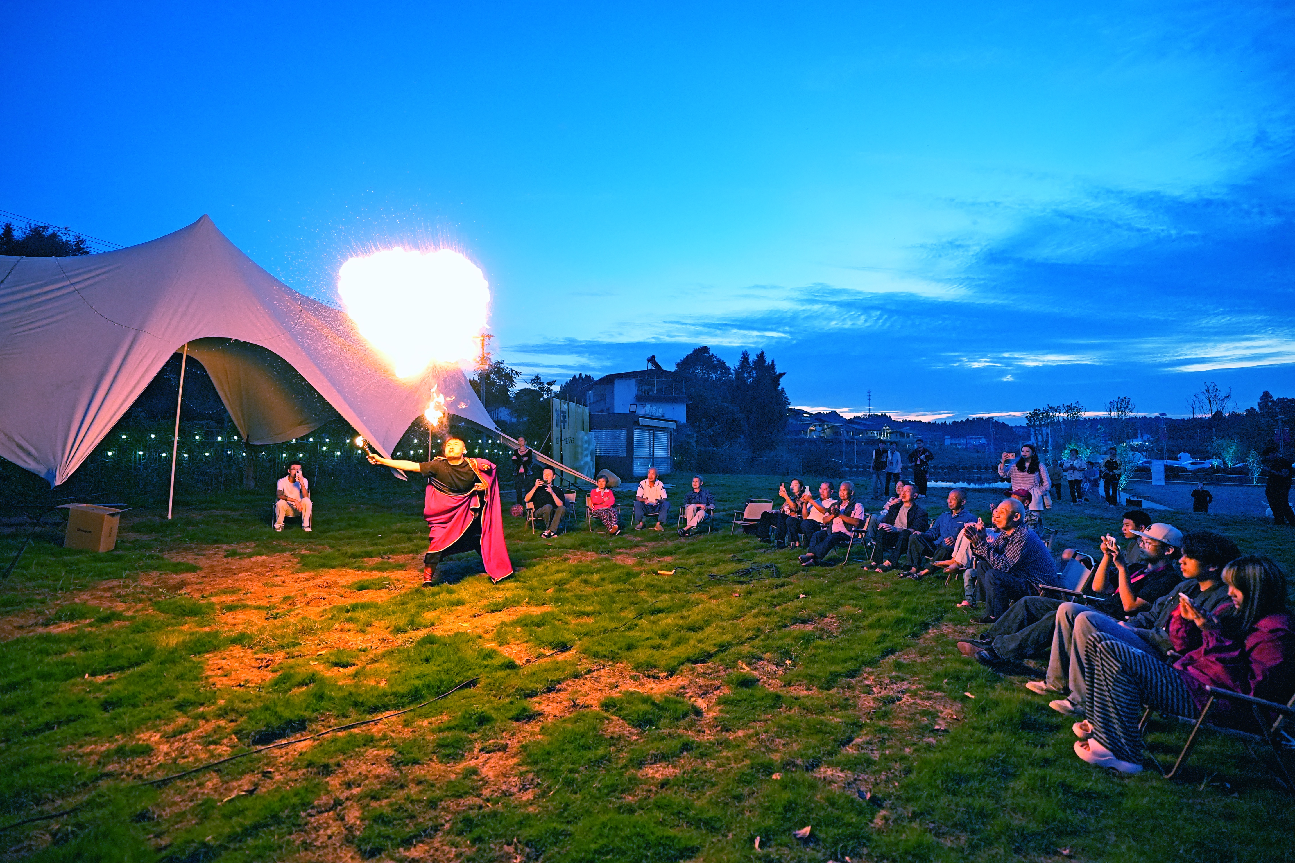 “帅府粮仓”露营基地吐火表演。