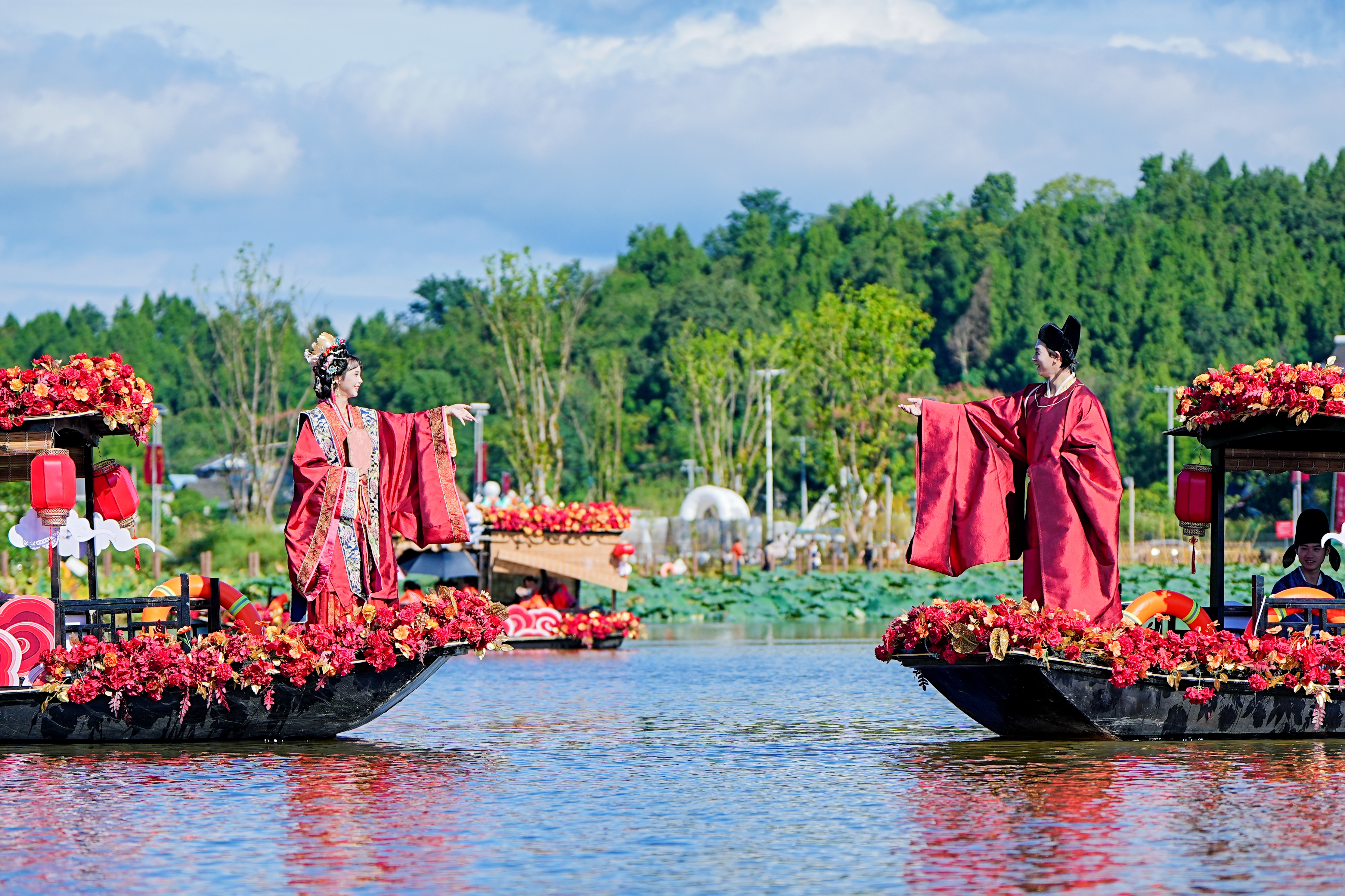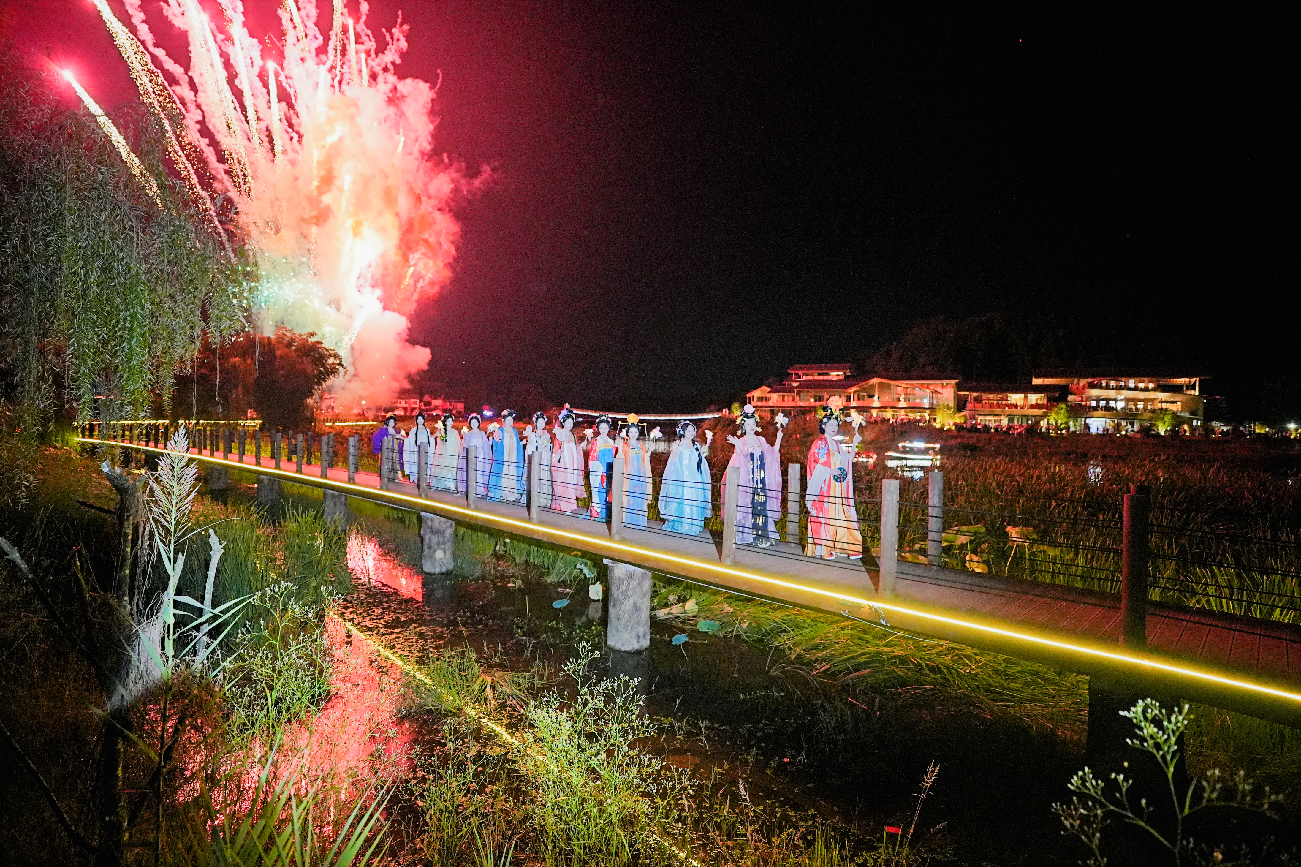 岔岔河岸边,“舟游帅府”项目的码头前排起小队,木质游船缓缓划过水面,游客们举着手机拍摄两岸的风景,不时有人对着“鱼鳞坝”的潺潺流水驻足打卡。傍晚时分,核心区的广场上早已坐满等待烟火秀的游客,孩子们拿着彩色气球奔跑,大人则围着售卖本地竹编、特产的摊位挑选伴手礼,田园间满是热闹的烟火气。