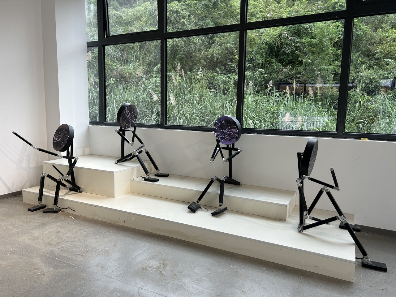 当天,在数字游民社区的近未来中心内,记者实地探访了这场展览:《宇宙的孩子》由六个特殊机器人构成,这些机器人不仅运用了Transformer 模型与自定义软件,还融合了不锈钢、碳纤维、扬声器、显示屏等多元材料,每个机器人都呈现出独特状态,仿佛在无声地进行着“对话”。