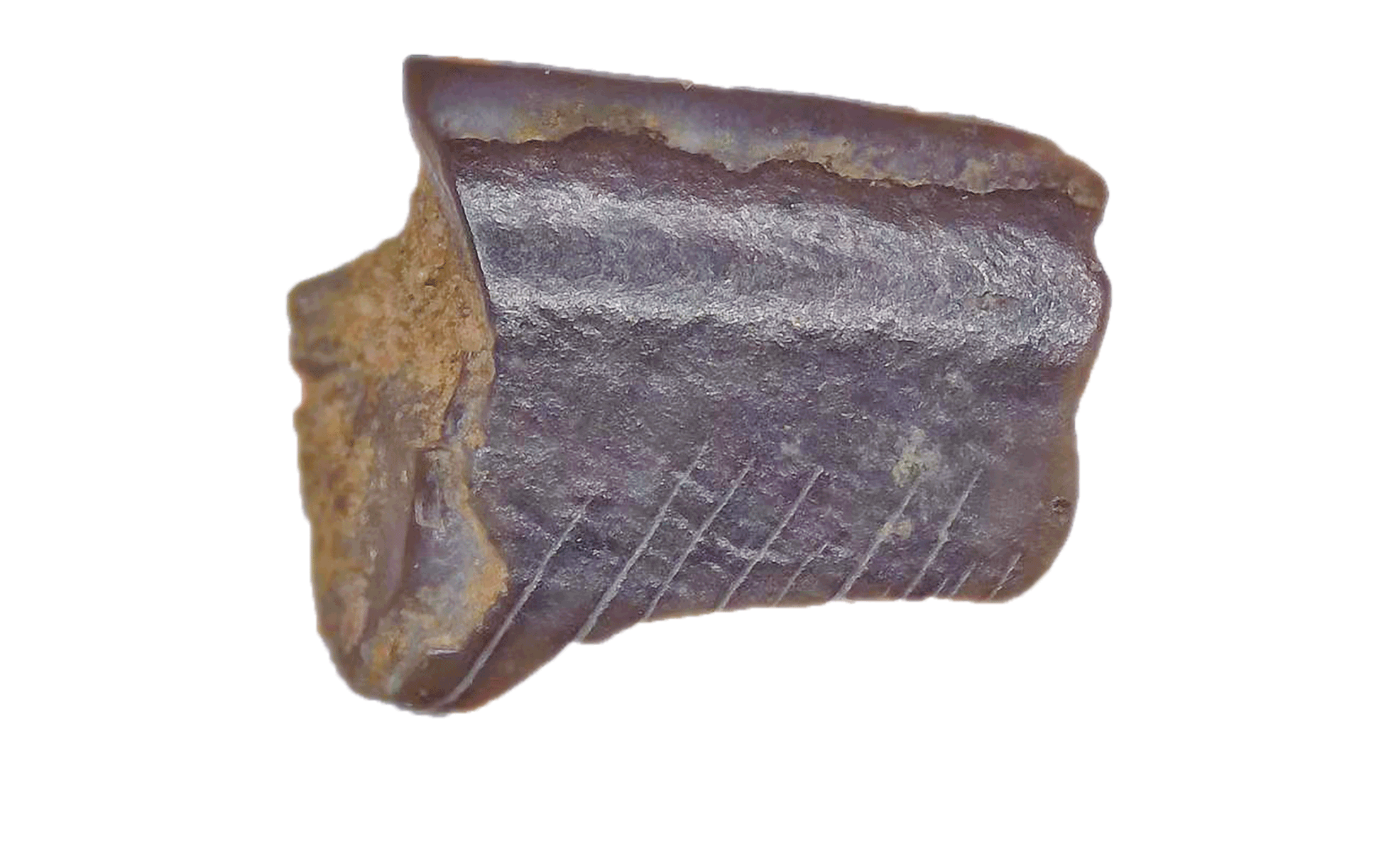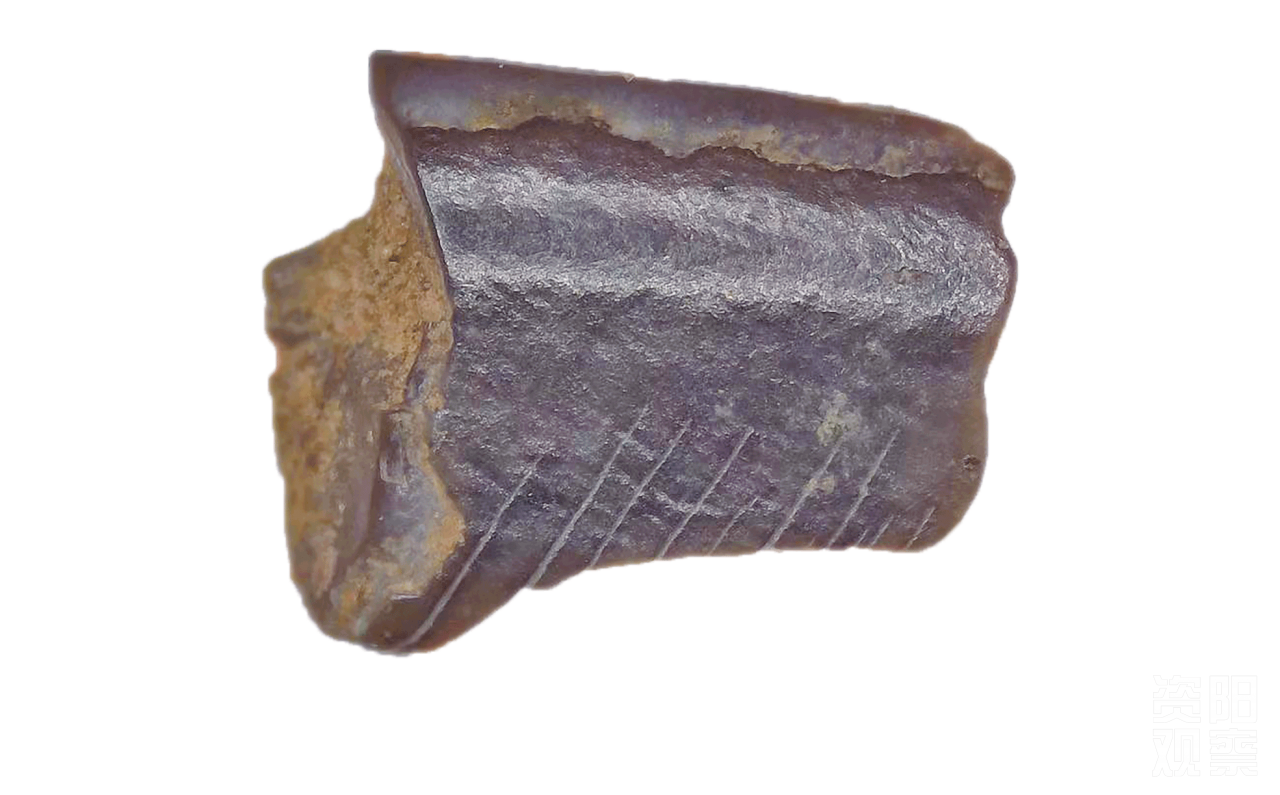 相较于同期或更早阶段零星见于贝壳、赭石等软性材质的刻划痕迹,资阳濛溪河遗址群的发现则更为系统与多样。刻划痕迹出现在骨片、橡果、石块、木块等多种材质上,目前已明确辨识的就有十余件。这些遗存中,既有排列规整的线条,也有“X”形。尤为令人惊叹的是,一片仅3.5毫米宽的骨片上,竟密集分布着11道整齐排列的刻痕。这些刻痕的制作需要相当精细的控制力,部分线条内部可见二次发力的痕迹。再考虑到骨片表面的弧度及各种人类行为特有的迹象,这显然是刻意为之的人类行为。