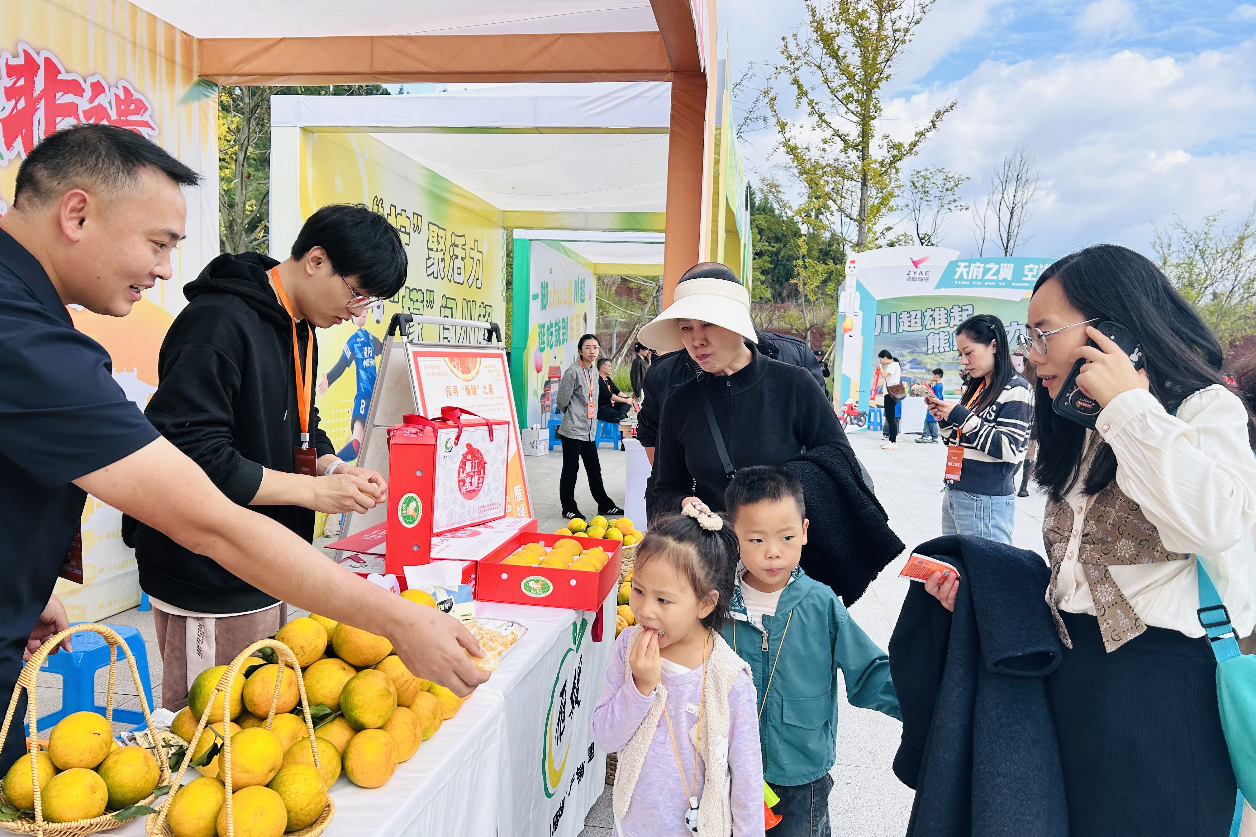 球迷品尝雁江特产“雁媛”柑橘。