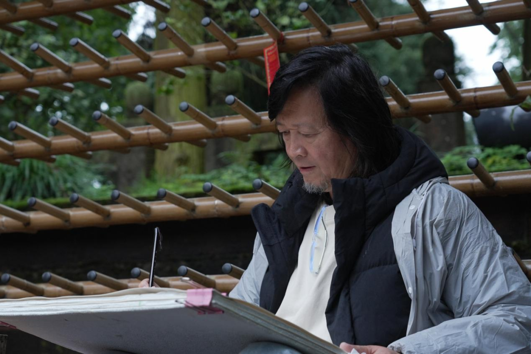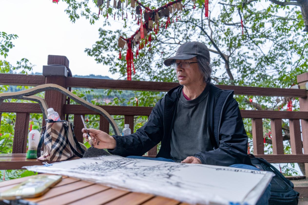 林容生(中国国家画院艺术家):我自己前几年曾来过乐山,但这次重访,无论是城市面貌、景区管理,还是文化氛围,都让我感受到显著的发展与提升。有些地方是旧地重游,有些则是首次踏足,但无论新旧,眼前的山水与人文景观都呈现出新的气象,这也促使我们在写生中不断调整视角、深化理解。从专业角度来看,乐山的山水具有鲜明的地域特色。无论是三江汇流的壮阔格局,还是峨眉山的灵秀峰峦,其地貌形态、植被特征和空间结构,都与其他地区的山水有着明显区别。在写生过程中,面对不同的具体对象,我们会不自觉地调整笔墨语言和构图方式,尝试用更贴切的艺术手法去表现这片土地的神韵。这种实践不仅是对景写生,更是一次技法的锤炼、观念的更新和艺术表达的提升。我们从中获得的不仅是写生作品,更是对未来创作的启发与积累。