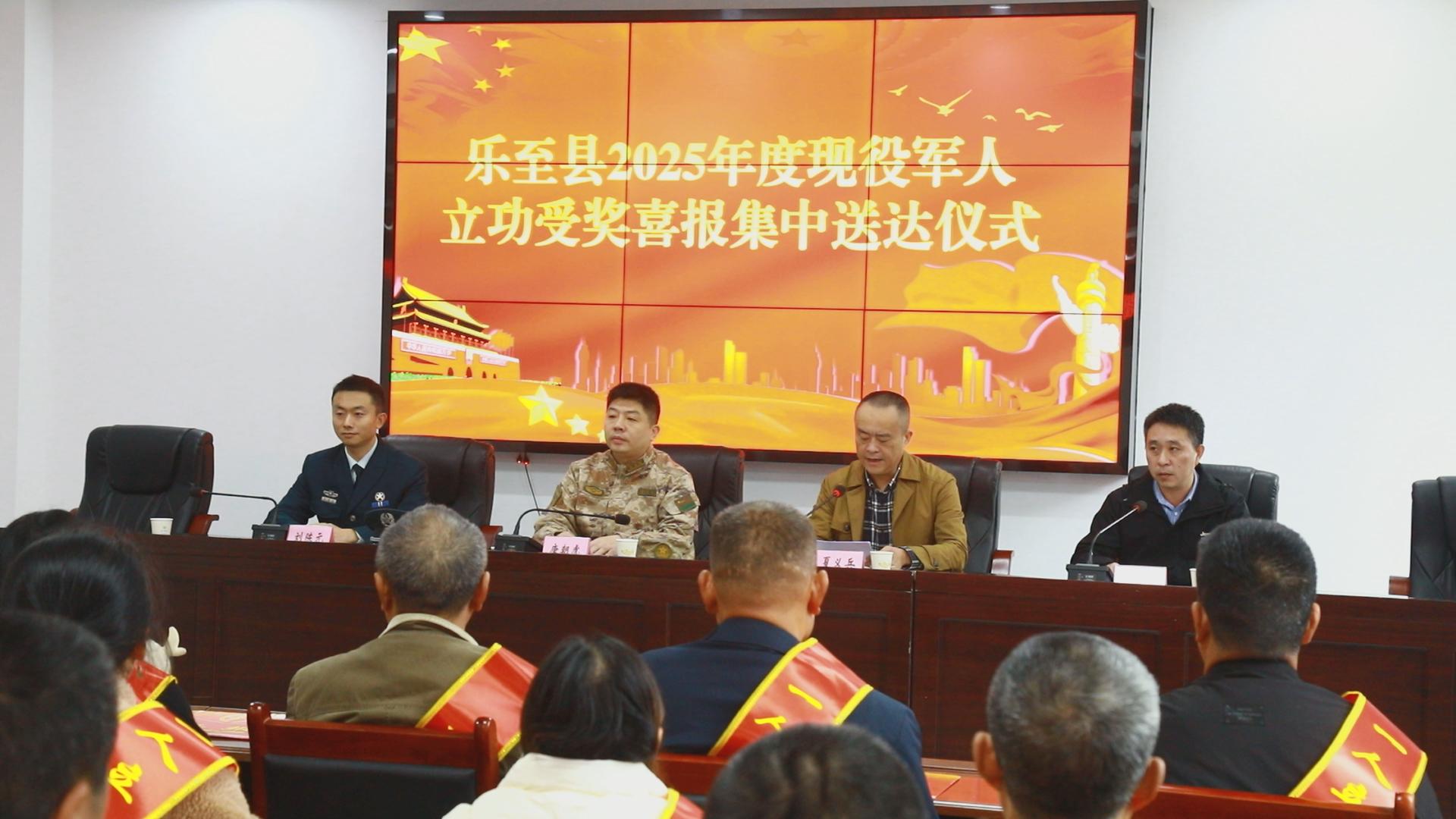 军歌嘹亮,荣光传家乡。近日,乐至县退役军人事务局院内气氛热烈,乐至县2025年度现役军人立功受奖喜报集中送达仪式在这里举行。8位乐至籍军人在部队立功受奖的喜报,被集中送到了他们的家人手中。