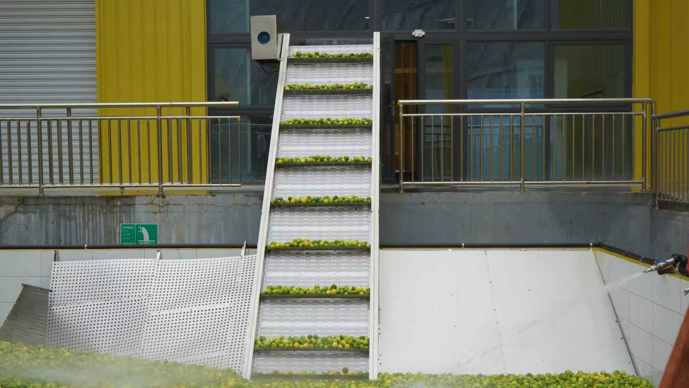 厂区内,工人们正将一筐筐新鲜的柠檬卸车,这些鲜果即将进入全自动生产线。在清洗车间,传送带上的柠檬正依次通过气泡清洗、毛刷辊清洗和纯净水喷淋清洗三道工序,确保达到直接榨取的洁净标准。