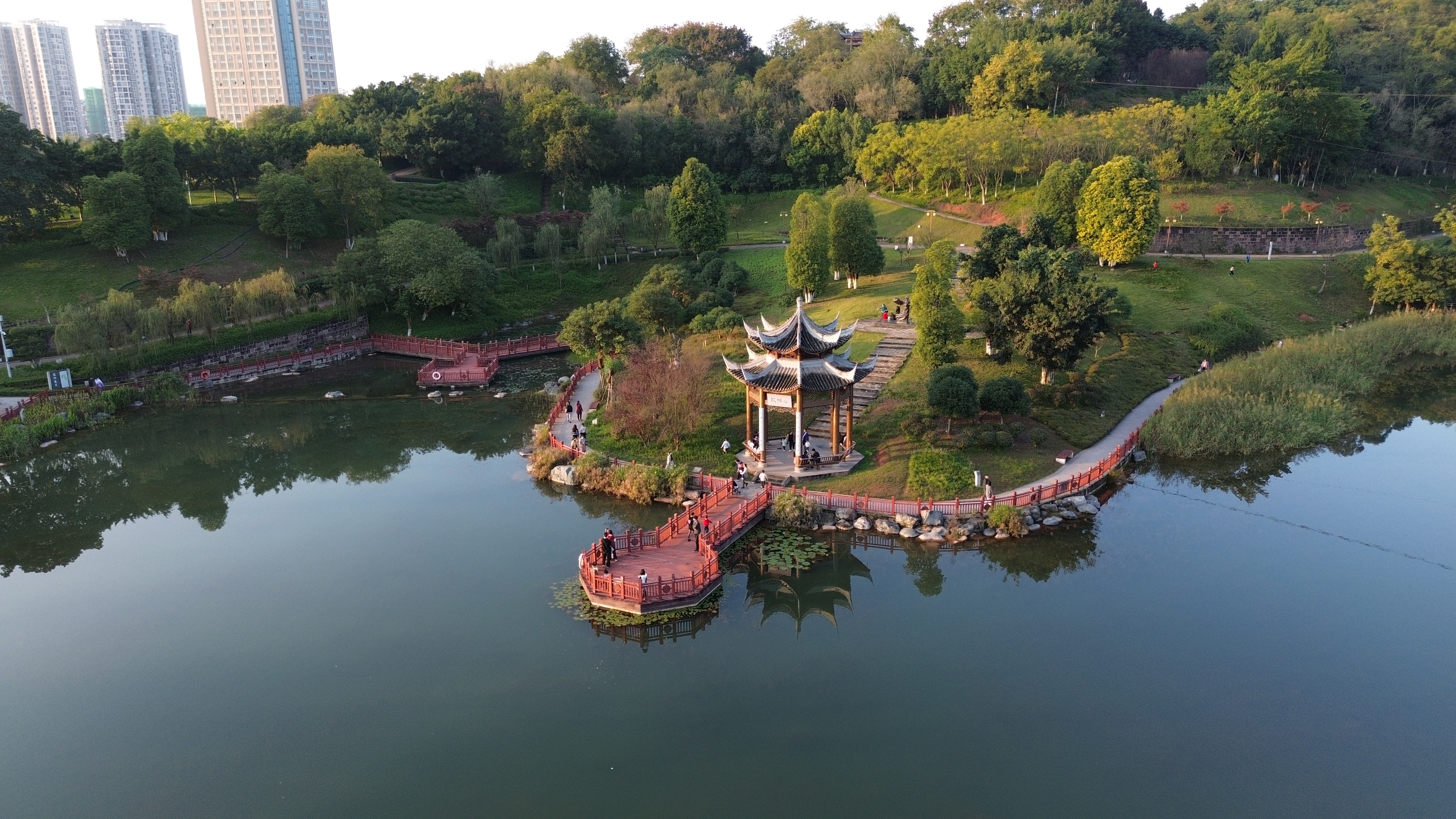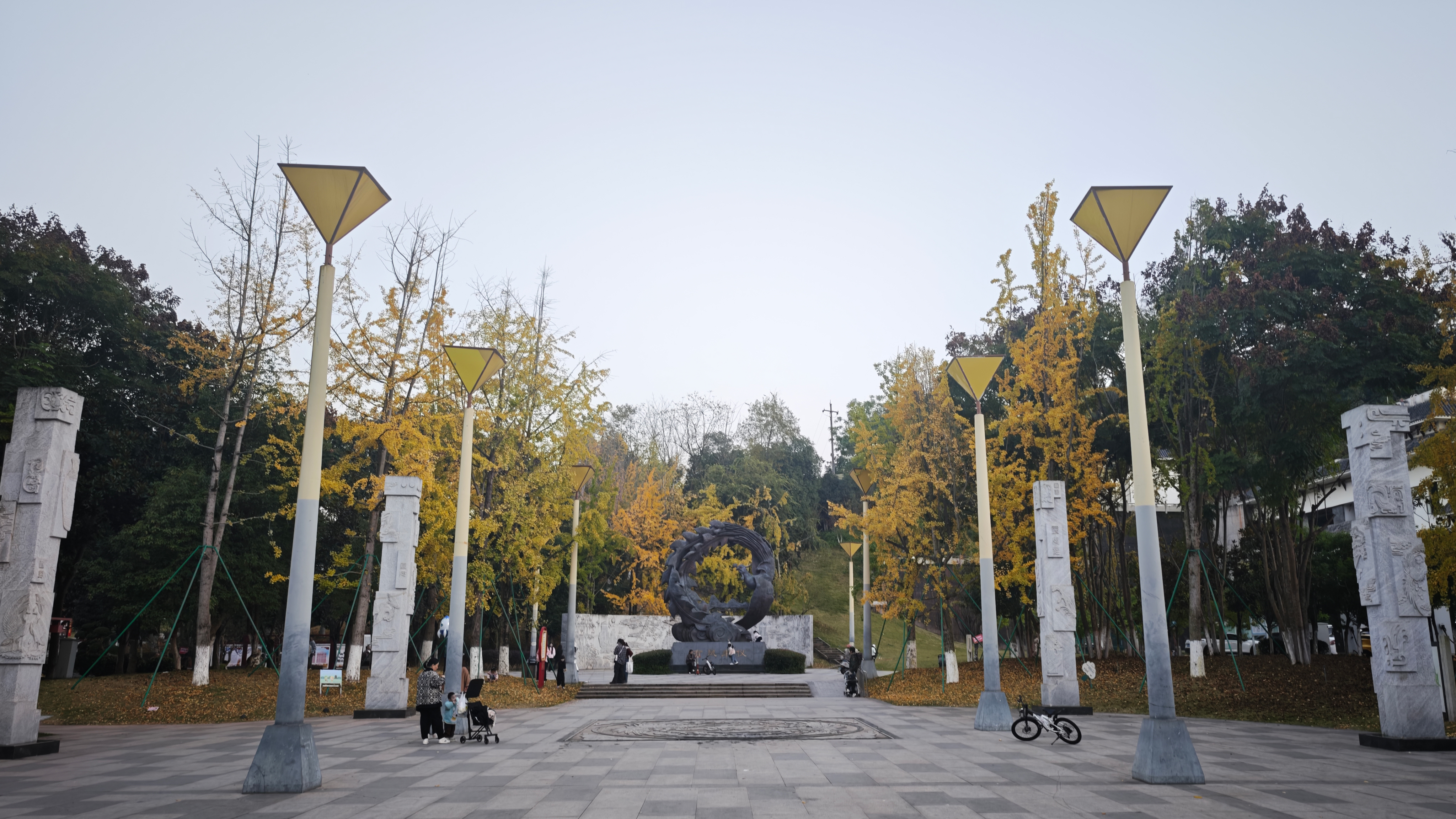 每年11月中下旬,公园内的银杏大道准时开启“黄金雨”模式,叶片随风轻摇洒落,铺就松软的金色地毯──这正是资阳初冬最动人的模样。若想将盛景尽收眼底,可登上凤岭阁登高远眺,俯瞰园区里树染黄绿的绝美景致;若偏爱静谧时光,便在林间长椅上捧杯热茶,任脚下踩着酥脆落叶发出“沙沙”声响,感受此刻的温润惬意。
