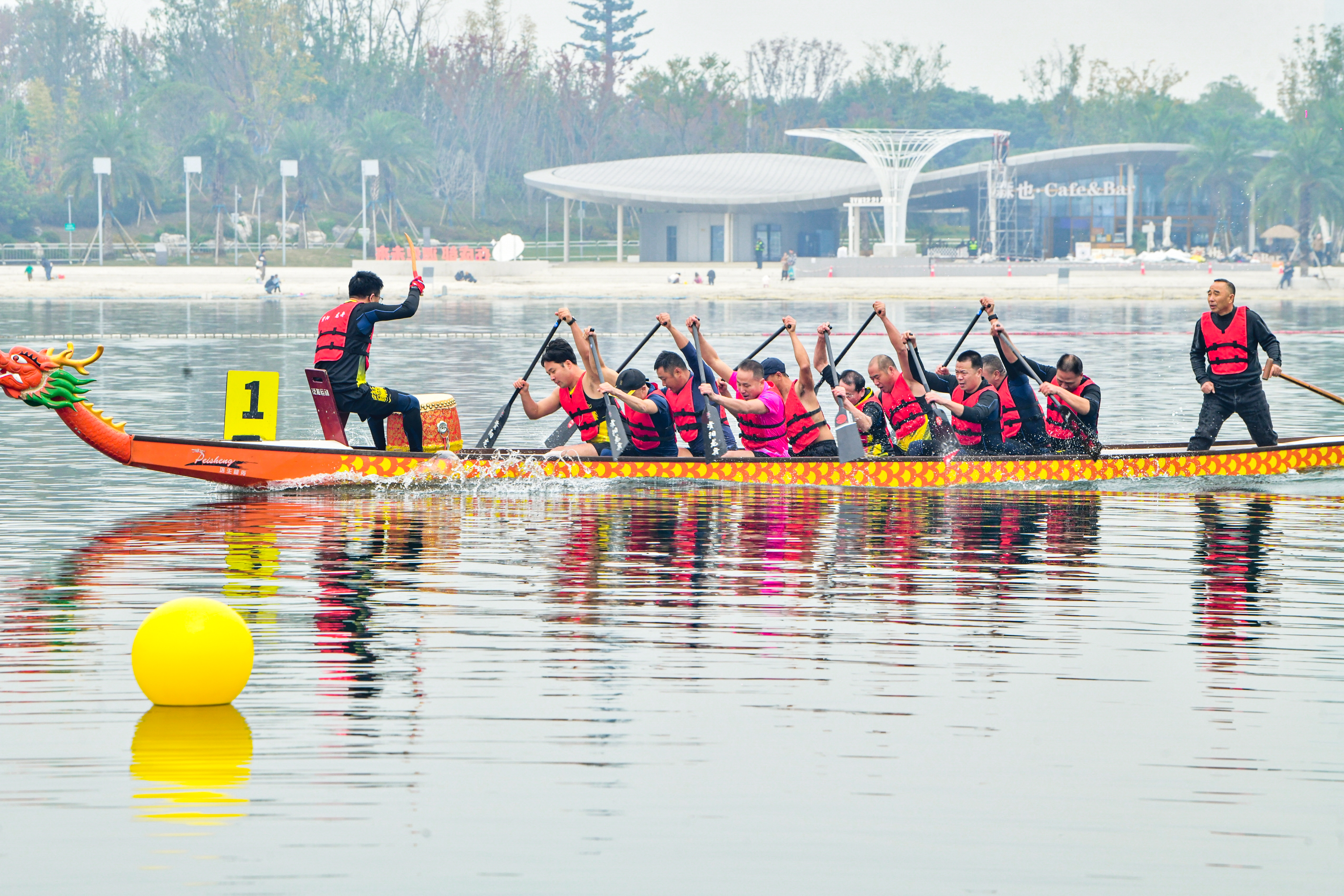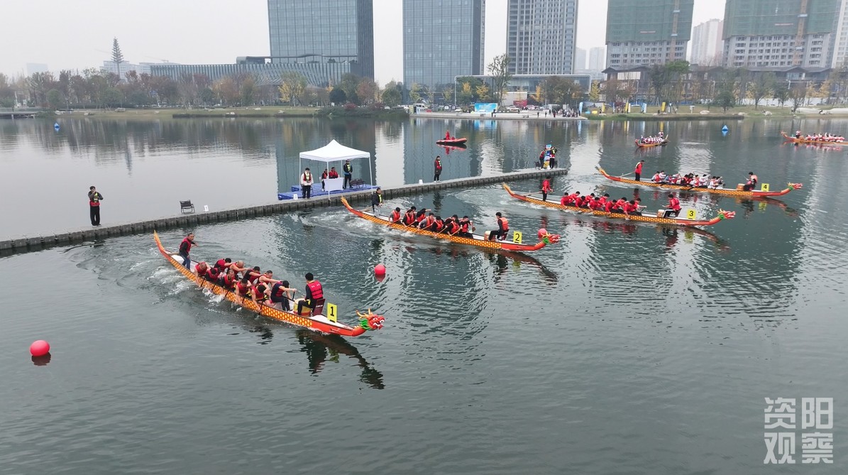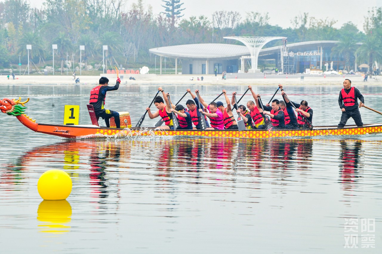 比赛现场鼓点激荡,舟桨齐飞。随着发令枪响,运动员们在水面上挥臂划桨、破浪前行,展现出团结协作、奋勇争先的龙舟精神。比赛中,龙舟在水面上疾驰而过,最终,资阳野人龙舟队勇夺成人组2500米追逐赛及200米直道赛两项第一!