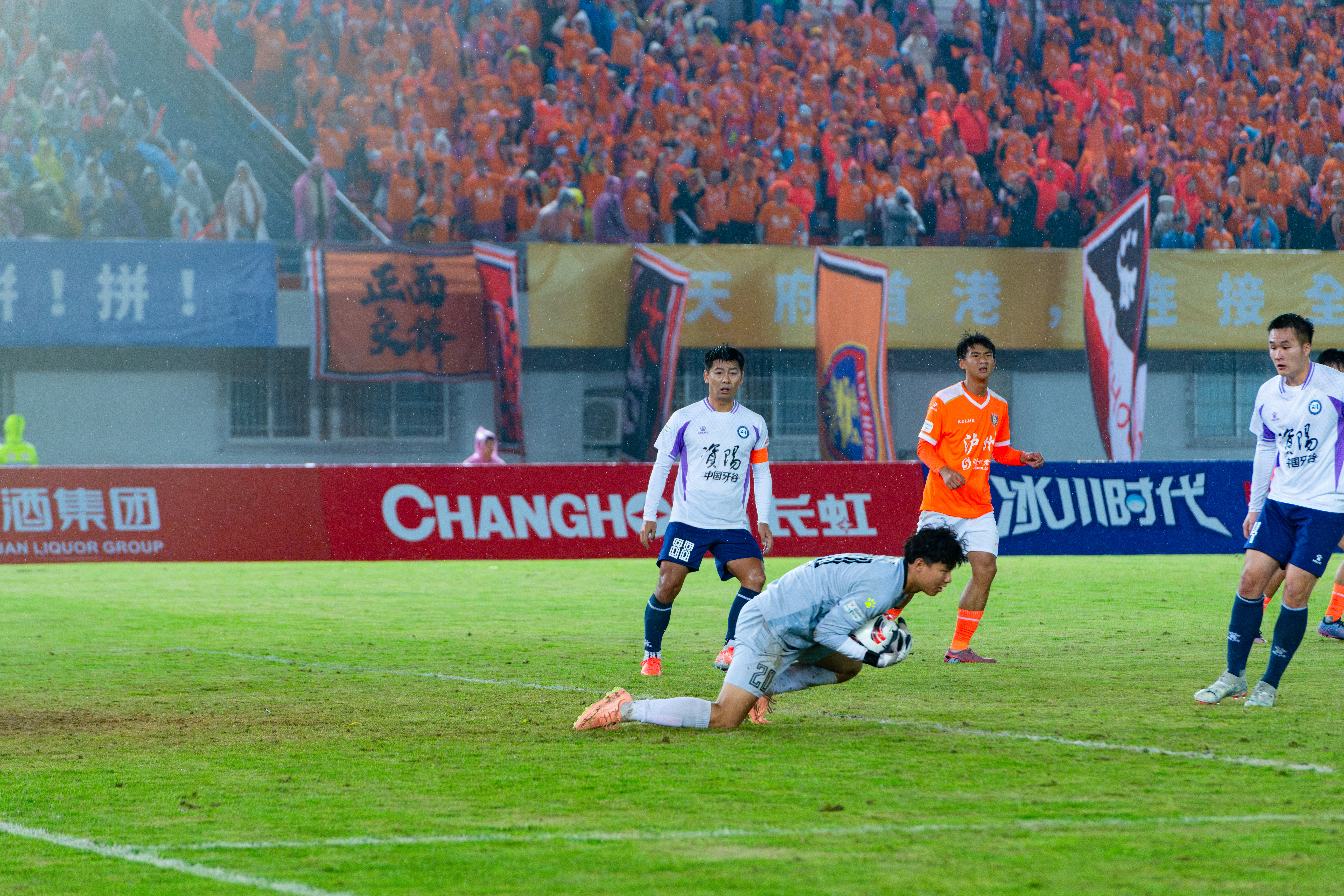 门将甘羽扑球。